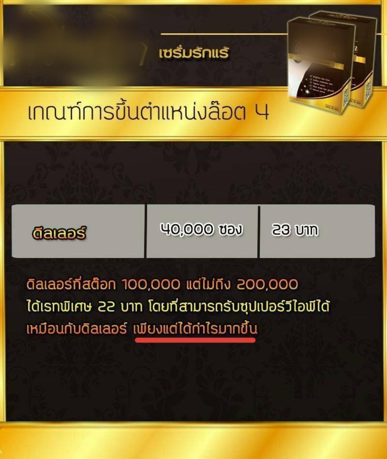 เมื่อโอนเงินเขาก็ดึงเข้ากลุ่ม..แต่ก็ยังไม่ได้สินค้า โดยอ้างว่าโรงงานผลิตไม่ทัน แต่หลังจากนั้นไม่กี่วัน “แม่ทีม” ซึ่งเป็นระดับดีลเลอร์ เขาก็เสนอให้เราสมัครเพิ่มขึ้นเป็น VIP GOLD เพื่อจะได้สินค้าเพิ่มขึ้นจะได้พอขาย ซึ่งจะรับได้ 1,000 ซอง โดยค่าสมัครก็เพิ่มขึ้น
