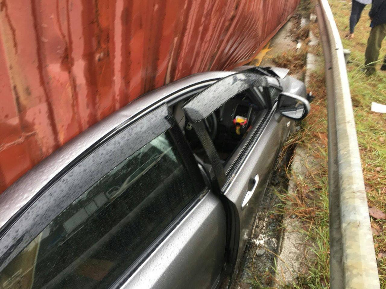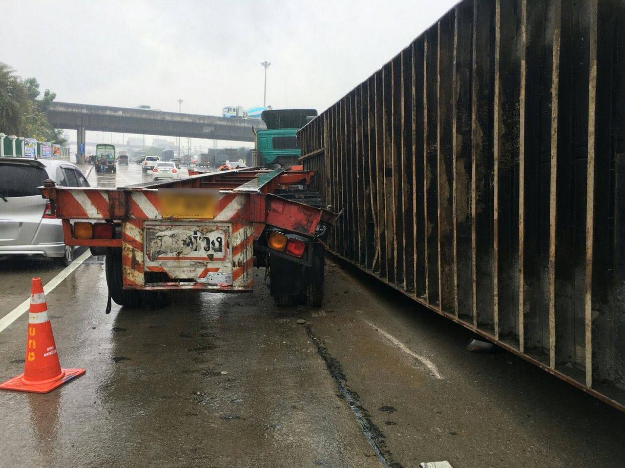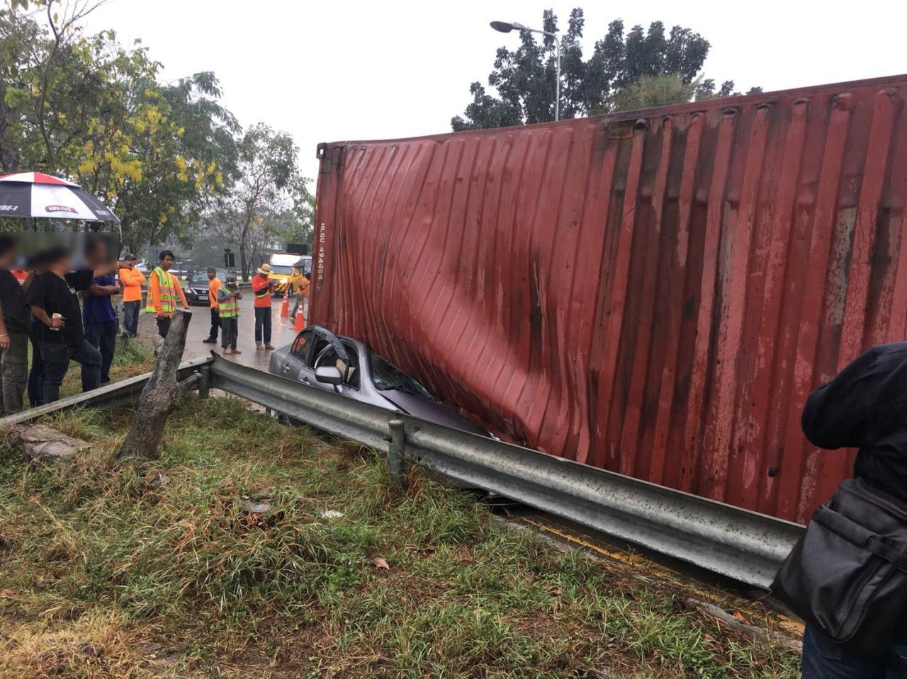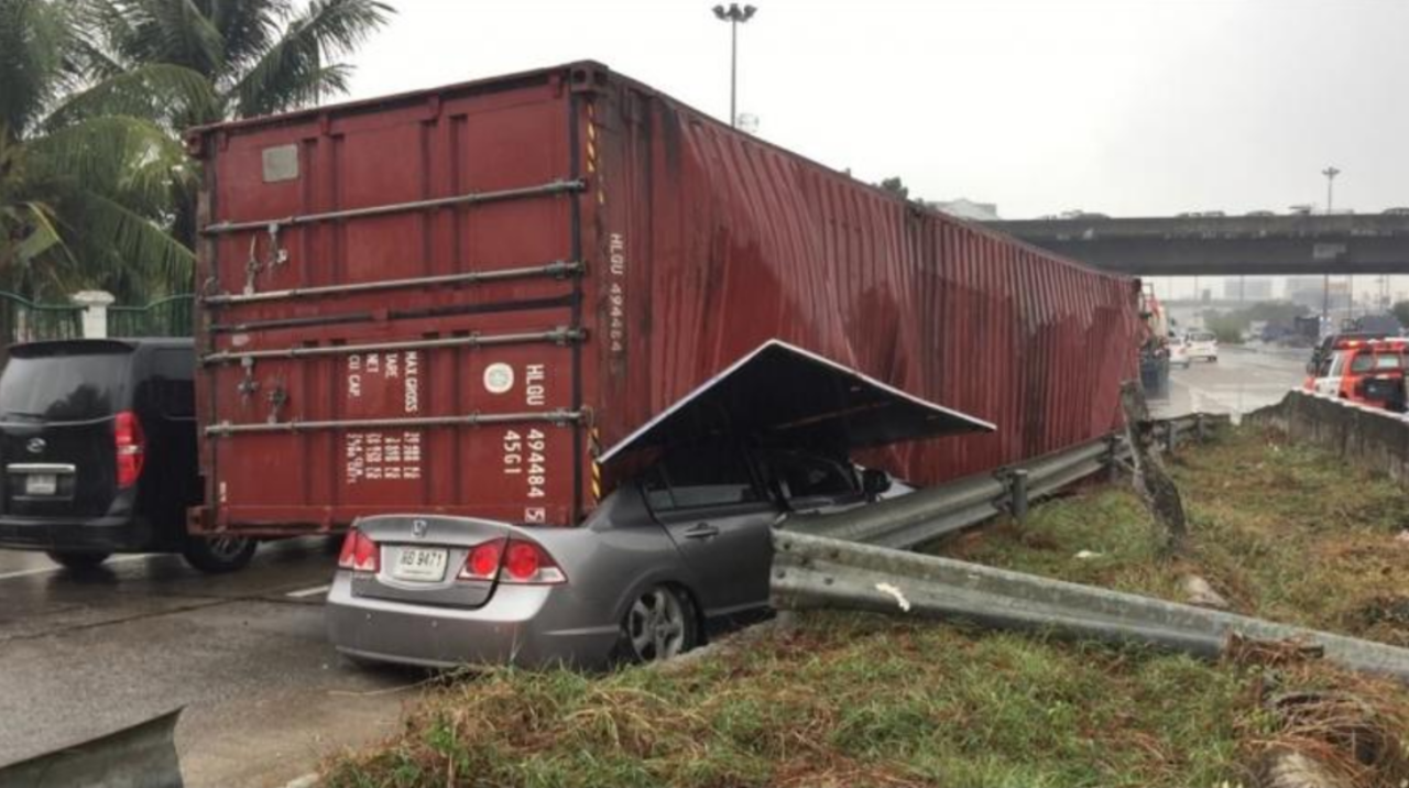 ช่วงเที่ยง ปลายเดือนธันวาคมปีที่ผ่านมา บนถนนกาญจนาภิเษก ฝนตกพรำๆ ถนนลื่น รถบรรทุกตู้คอนเทนเนอร์ 18 ล้อ ตีโค้งไม่รู้อีท่าไหน จนทำให้ตู้คอนเทนเนอร์หลุดออกมาจากตัวรถ ทับลงไปบนรถเก๋งซีวิค ภายในมีชายวัย 59 ปี อยู่ในตัวรถ แต่เคราะห์ดี สติได้ คนขับเก๋งรอดตายหวุดหวิด โดยมีเพียงบาดแผลที่แขนซ้าย ข้อมือแตก กระดูกหักเพียงเท่านั้น