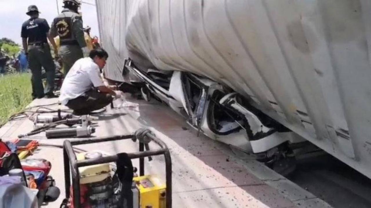 คอนเทนเนอร์ร่วงจากทางยกระดับ ขยี้รถตู้แบน คนขับตายคาที่