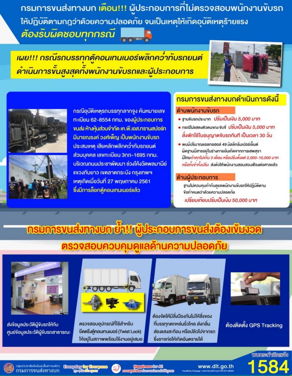 “หากพบว่า ผู้ขับรถละเลยมีความผิดเปรียบเทียบปรับสูงสุดไม่เกิน 5,000 บาท และในส่วนของผู้ประกอบการมีความผิดปรับสูงสุดไม่เกิน 50,000 บาท ฐานไม่กำชับให้ผู้ขับรถล็อกสลักตู้คอนเทนเนอร์” อธิบดีกรมการขนส่งทางบก ย้ำชัดๆ ถึงความผิดปมไม่ล็อกตู้คอนเทนเนอร์