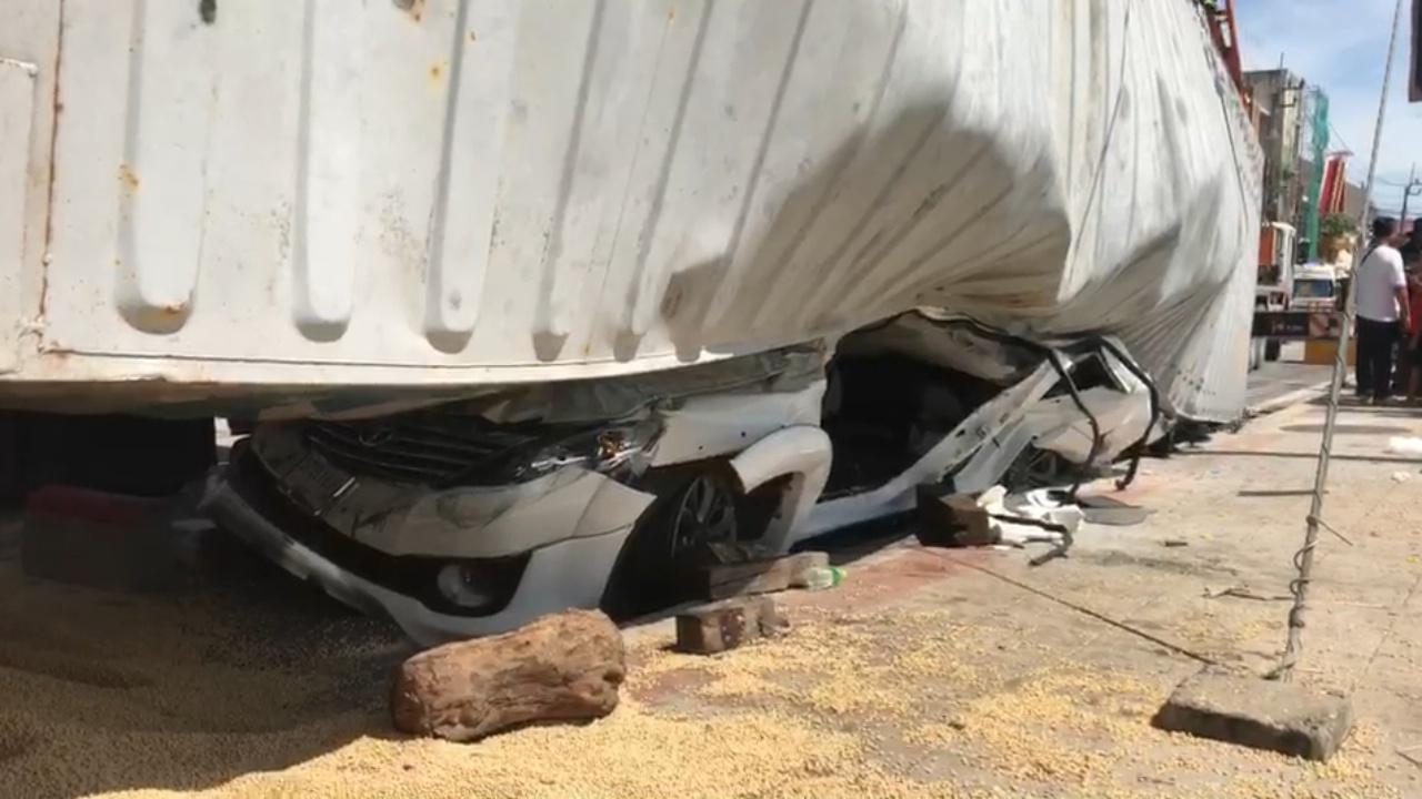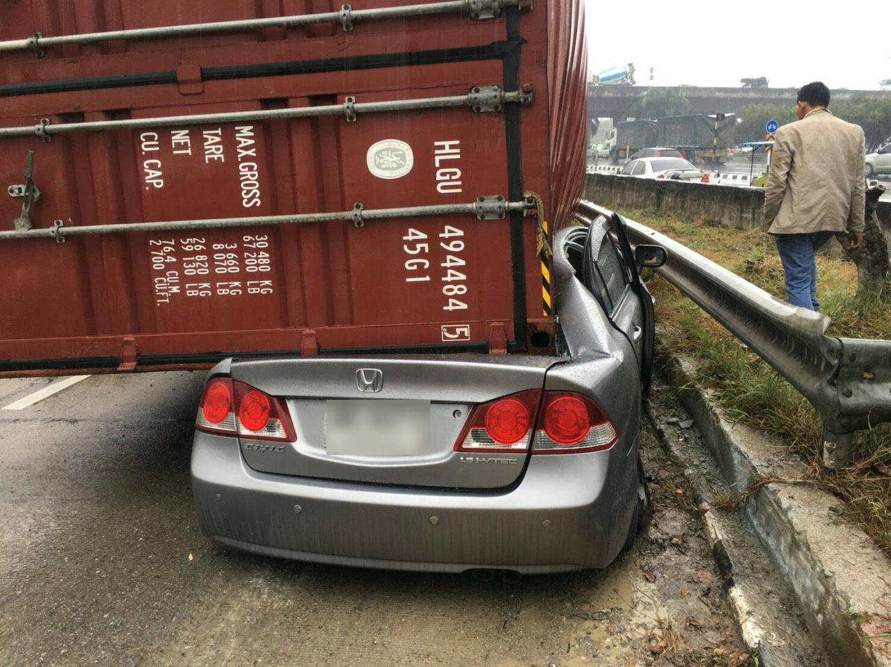 ตู้คอนเทนเนอร์หลุด ทับรถเก๋งบี้คาถนน คนขับรอด!