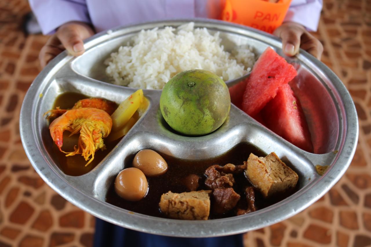 ภาพเด็กนักเรียนประถมไทย ดวงตากลมแบ๊ว นั่งล้อมวงรับประทานอาหารกลางวัน ในถาดอาหารหลุม ที่สามารถใส่อาหาร อะไรต่อมิอะไร ลงไปได้ตั้งหลายอย่าง เพื่อให้เยาวชนเหล่านั้น สามารถเจริญเติบโตขึ้นมาเป็นสมบัติล้ำค่าของประเทศไทยต่อไปในอนาคต