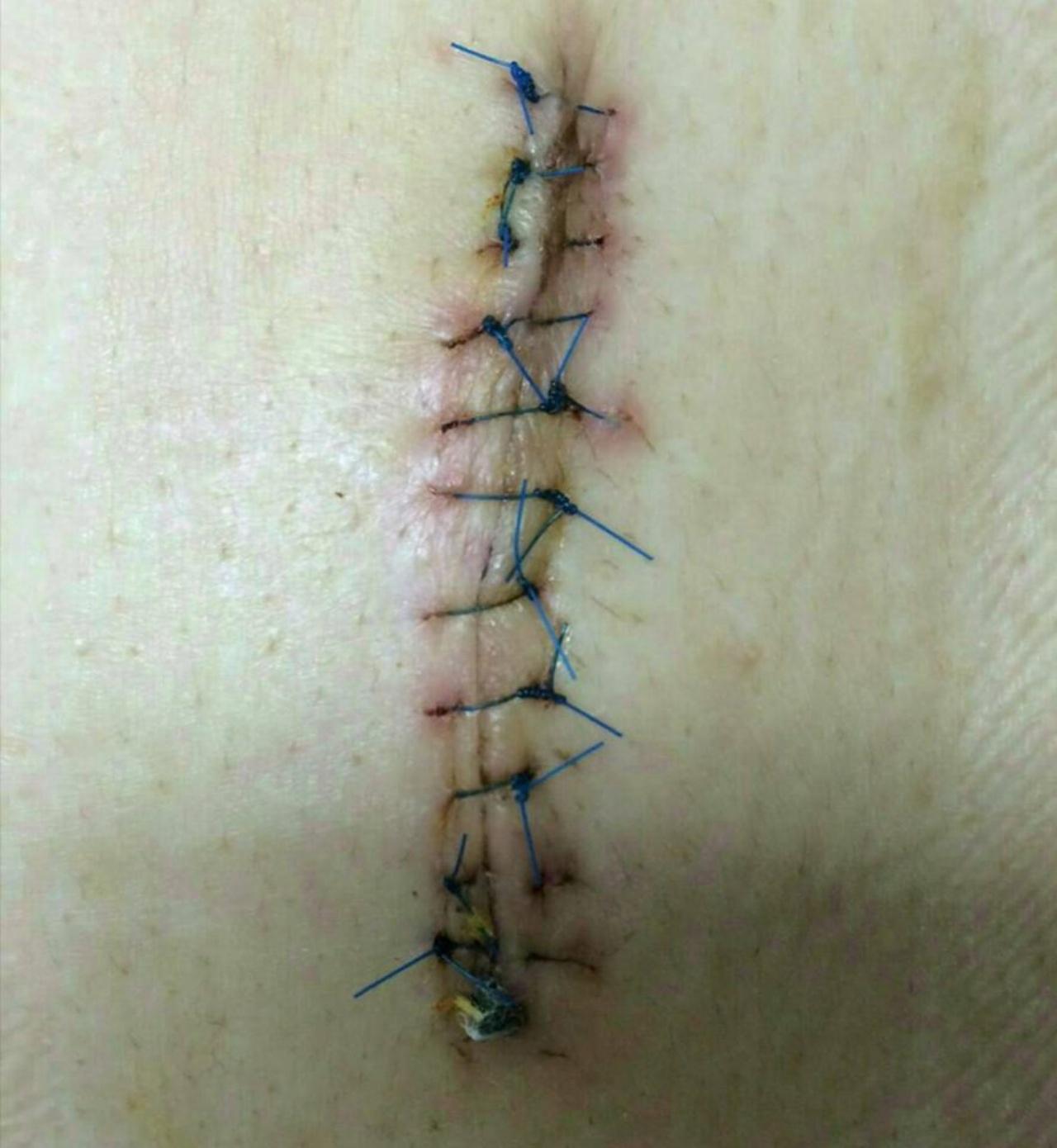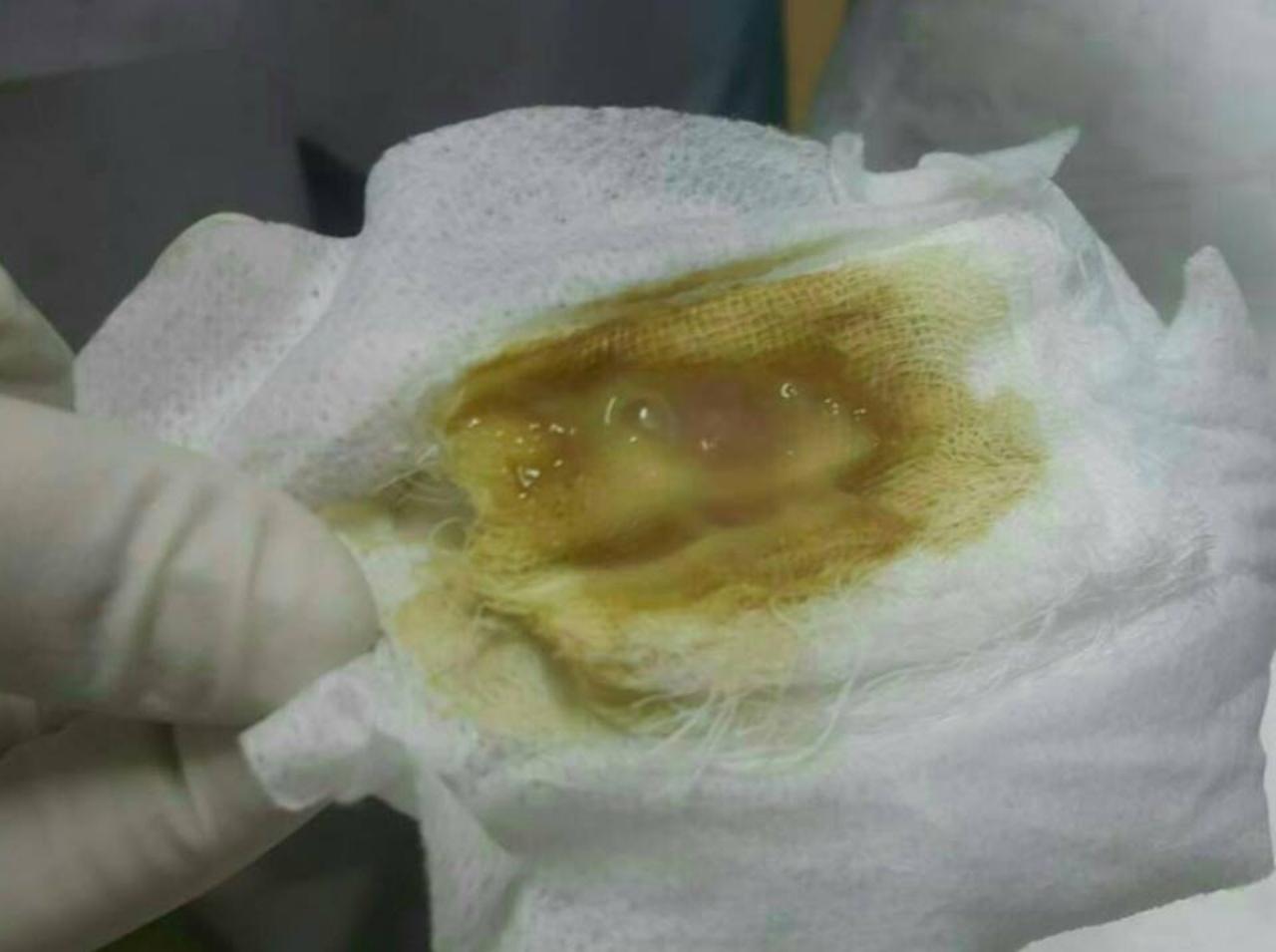 กระทั่งเช้า หมอที่โรงพยาบาลแห่งหนึ่ง ที่พัทยา เขาก็แนะนำว่ายังไงก็ต้องเปิดปากแผล เขา ฉีดยาชา กรีดเบาๆ แล้วล้างแผล จากนั้นเขาก็เอาผ้าก๊อซปิดปากแผลไว้ และให้มาล้างแผลทุกวัน แต่เนื่องจากเราอยู่ที่ จ.ระยอง เราจึงไปรักษาที่ รพ.ระยองต่อ เราล้างแผลที่โรงพยาบาลทุกวัน จนเกือบ 1 เดือนหลังทำศัลยกรรม หนองก็ยังไหลออกมาทะลุผ้าก๊อซ