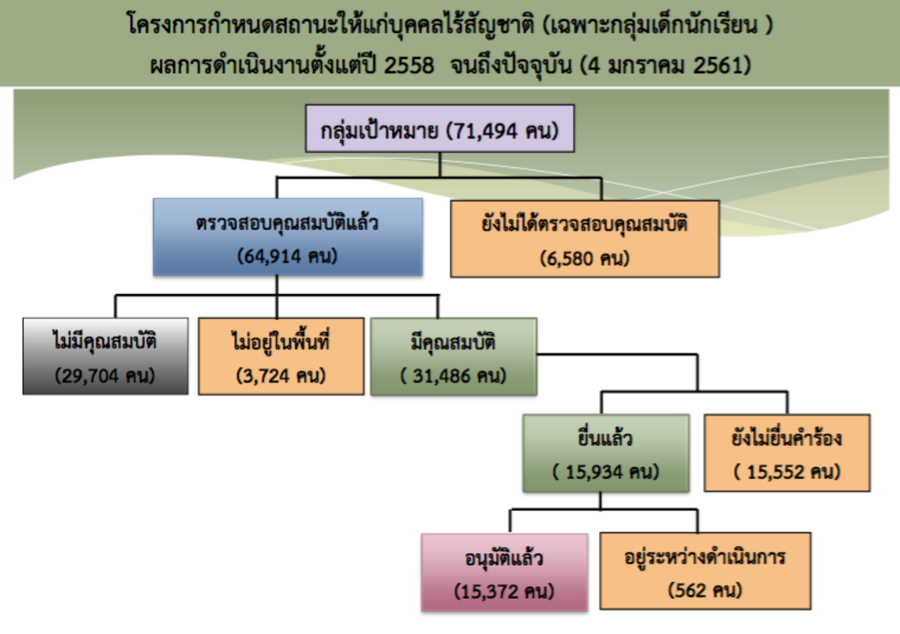 “คนไร้สัญชาติจะมีชื่อ ในทะเบียนประวัติ ดั้งเดิมจะมีการจำกัดเขตให้ออกนอกพื้นที่ในระดับอำเภอ แต่เดี๋ยวนี้ขยายมาเป็นระดับจังหวัด และให้ย้ายที่อยู่ ทำงาน เรียนหนังสือได้ เพียงแต่ยังไม่ได้สัญชาติไทยเท่านั้นเอง สมัยก่อนมีอำนาจเฉพาะรัฐมนตรีกระทรวงมหาดไทยคนเดียว คณะกรรมการพิจารณาเดือนนึง 100-200 คน เดี๋ยวนี้กระจายอำนาจไปที่นายอำเภอ และผู้ว่าฯ ก็ทำพร้อมกันทั่วประเทศ เดือนนึงทำได้หลายพันคน ปีหนึ่งเป็นหมื่นๆ คน ก็จะทยอยหมดไป