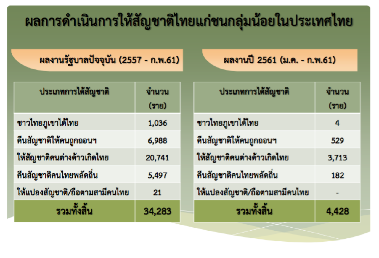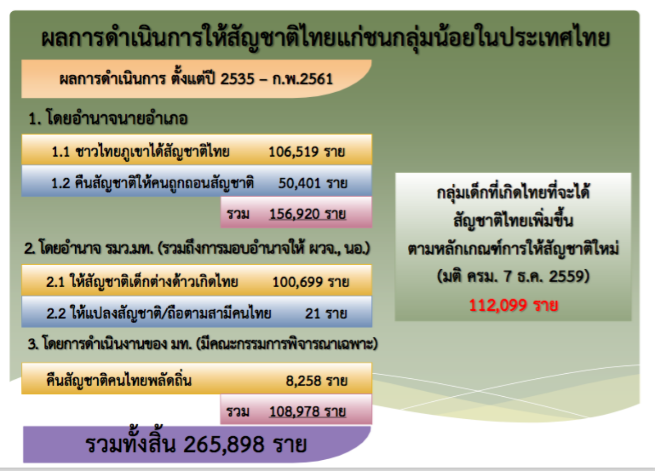 การให้สัญชาติไทย ในปี 59 มีการมอบอำนาจให้นายอำเภอ กับผู้ว่าราชการจังหวัด เป็นคนพิจารณาสัญชาติชนกลุ่มน้อย และมีการให้สัญชาติไปหลายหมื่นคนในระยะเวลา 2 ปีแล้ว ตาม พ.ร.บ.สัญชาติไทย แบ่งคนที่จะได้สัญชาติไทยเป็น 2 ลักษณะ