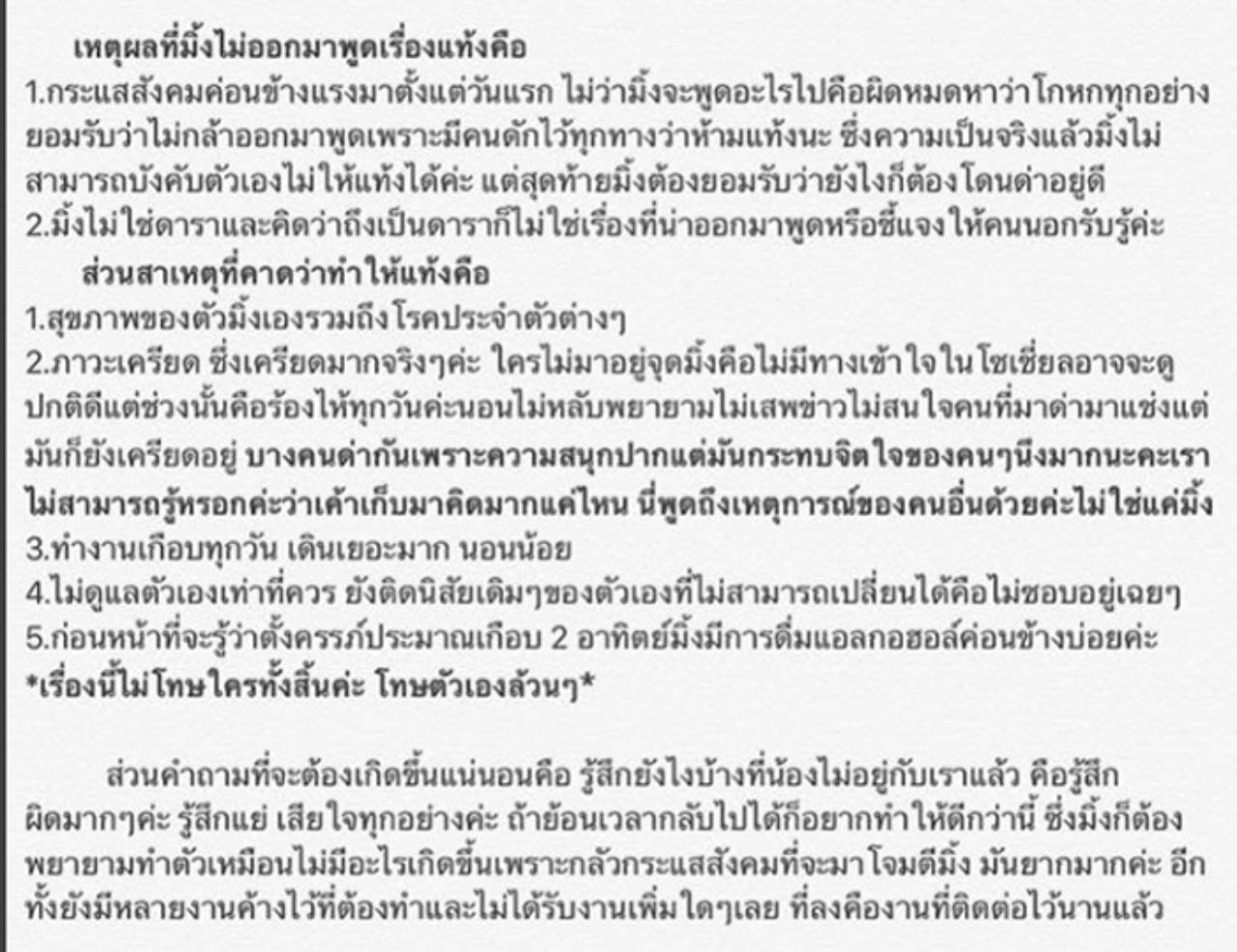 อย่างไรก็ตาม ในเวลาต่อมา ฝ่ายหญิงก็ได้มาโพสต์ยอมรับในอินสตาแกรมส่วนตัวว่าแท้งลูก...แต่ก็มีชาวเน็ตขุดเรื่องราวดราม่า สงสัยว่า “ไม่ได้ท้อง” จริงๆ ขณะที่ฝ่ายหญิงก็ยืนยันว่าสาเหตุที่แท้ง เพราะทำงาน เครียด และดื่มสุรา