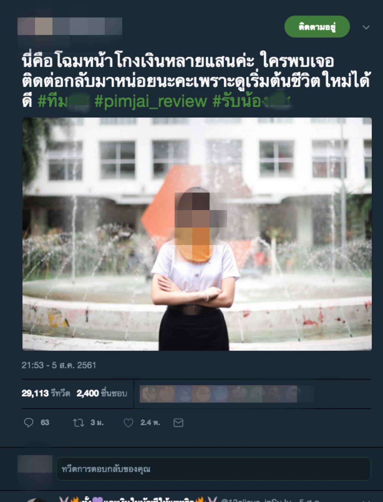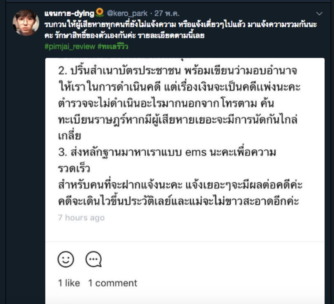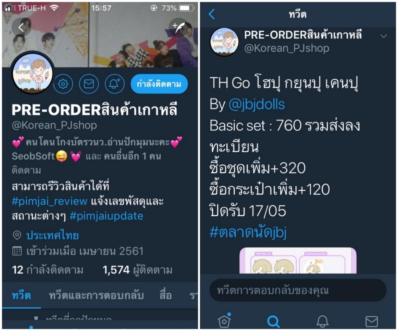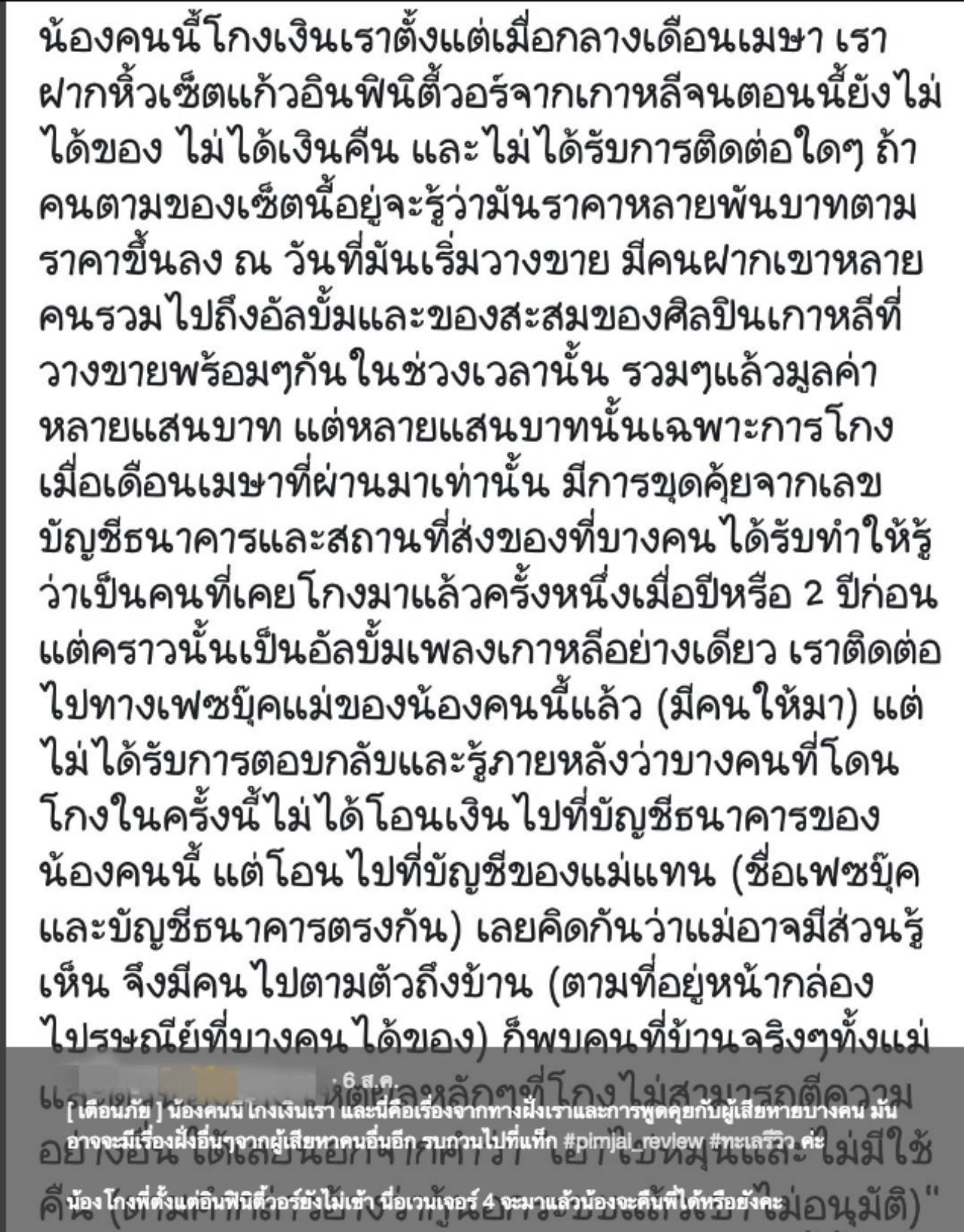 “มีหลายคนตั้งข้อสังเกต ว่าร้าน Pimjai @Korean_PJshop กับอีกร้านหนึ่งที่มีแอคเคาต์ในทวิตเตอร์ ใช้เลขบัญชี แม่ของน้องคนนั้น เหมือนกัน จึงได้มีการสอบถามไป แต่ก็ได้รับการปฏิเสธว่าเป็นคนละร้านกัน กระทั่งผ่านไปอีก 2 เดือนก็ยังไม่ได้ของเช่นเดิม”