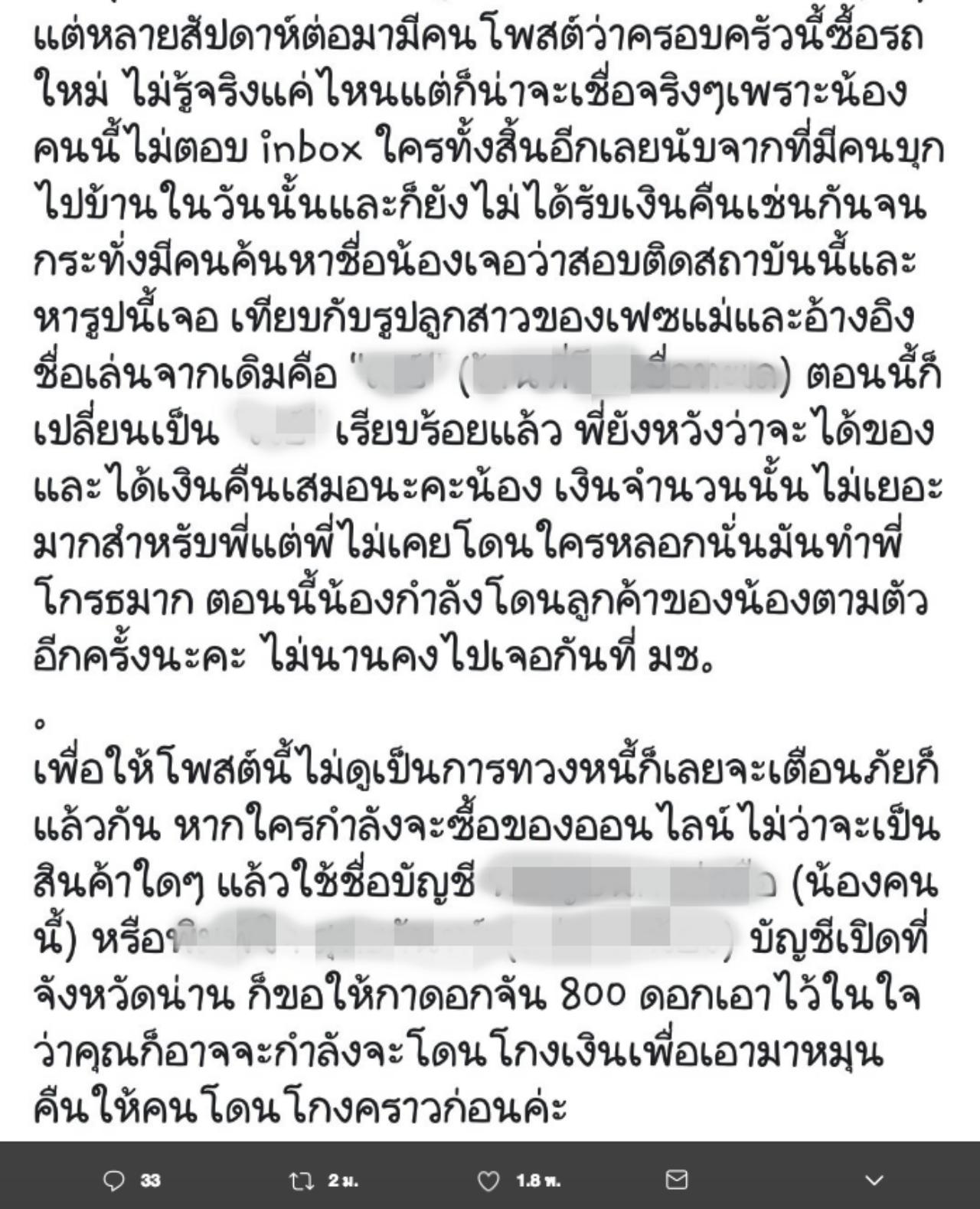 ...ถามว่า ถ้าได้เจอจะสงสารน้องหรือเห็นใจหรือไม่ ตอบตรงๆ ว่า “เราหมดความสงสารแล้วค่ะ เพราะว่า พวกเราใจดีกับน้องมากๆ แล้ว ที่ปล่อยเรื่องปิดเงียบมา 4-5 เดือน ใจดีขนาดที่ว่าตามไปที่บ้านยังไม่ได้ของก็ไม่ทำอะไร แจ้งความอายัดบัญชี แต่น้องมาขอให้ถอนอายัดเพื่อจะได้เอาเงินคืนก็ถอนให้ แต่ก็ไม่ได้คืน”