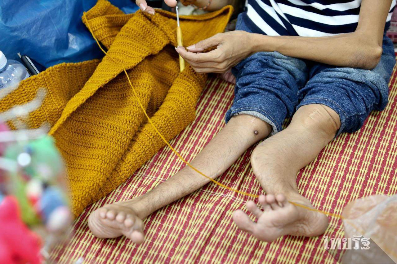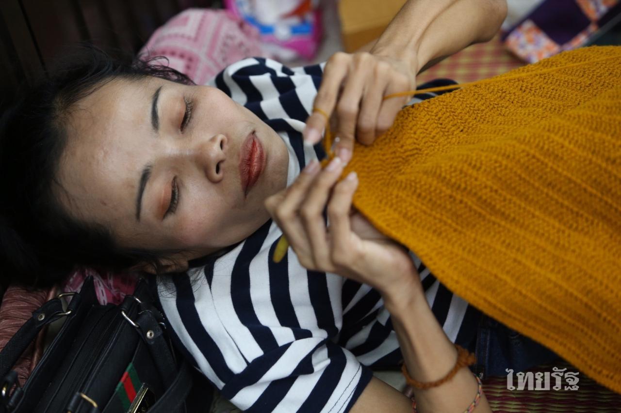 สายฝน วางมือจากการถักไหมพรม ก่อนหันมาตอบว่า “หนูไม่รู้ว่าเหนื่อยยังไง แต่บางทีแค่อยากจะร้องไห้ มันหนักเกินไปสำหรับหนู มันไม่ใช่อุปสรรคแค่ครั้งนี้ครั้งเดียว แต่มันเกิดตั้งแต่ 20 กว่าปีก่อนแล้ว ตอนที่พ่อเสีย หนูต้องรับผิดชอบภาระทั้งหมด หาค่านมให้น้อง ดูแลแม่ จนถึงทุกวันนี้ ทั้งที่ร่างกายตัวเองเป็นแบบนี้ ถามว่าเคยกินอิ่มมั้ย ไม่เคย (เสียงสั่นเครือ) ถ้าจะกินอิ่มก็คือเวลากลับไปบ้านนอก ไปกินข้าวพร้อมแม่ นั่นถึงจะอิ่ม (ร้องไห้) ต่อให้หนูกินอาหารที่ดี หรูหรา แต่ถ้าไม่มีแม่หนูก็กินไม่ลง”