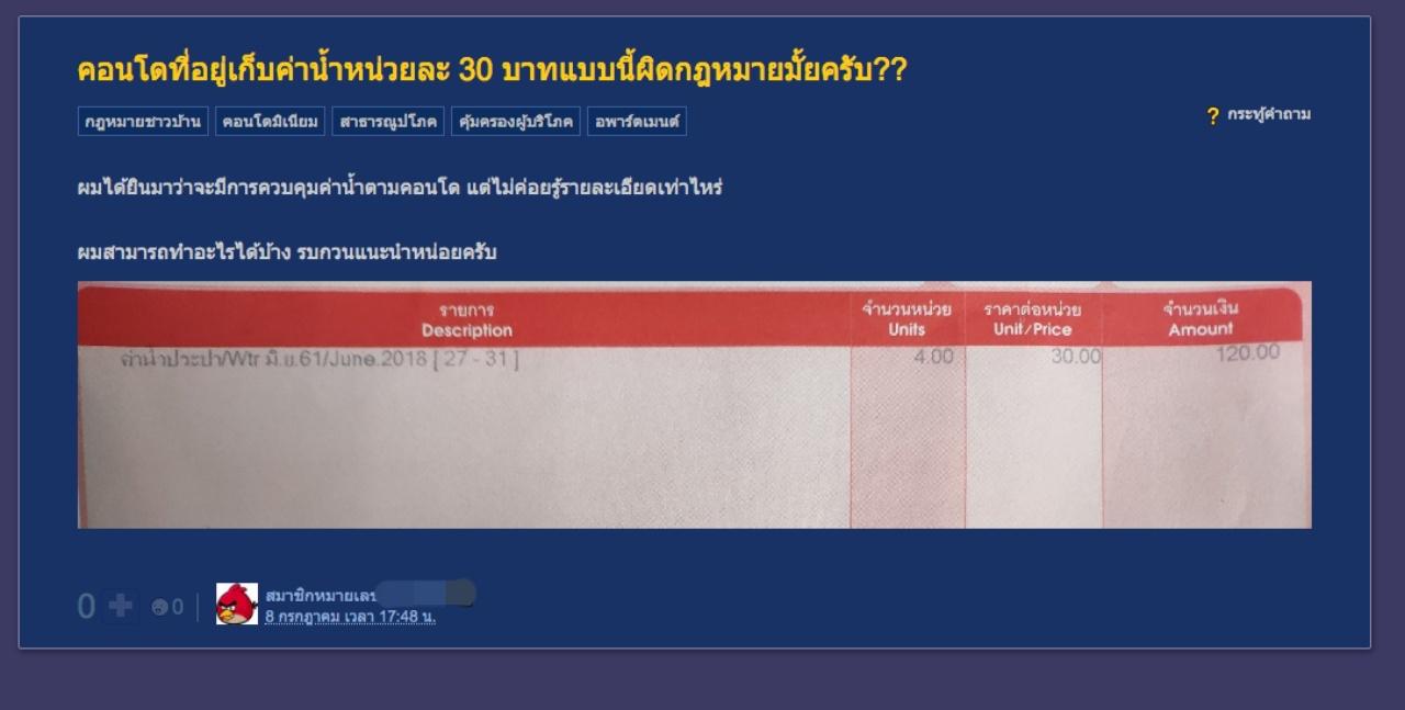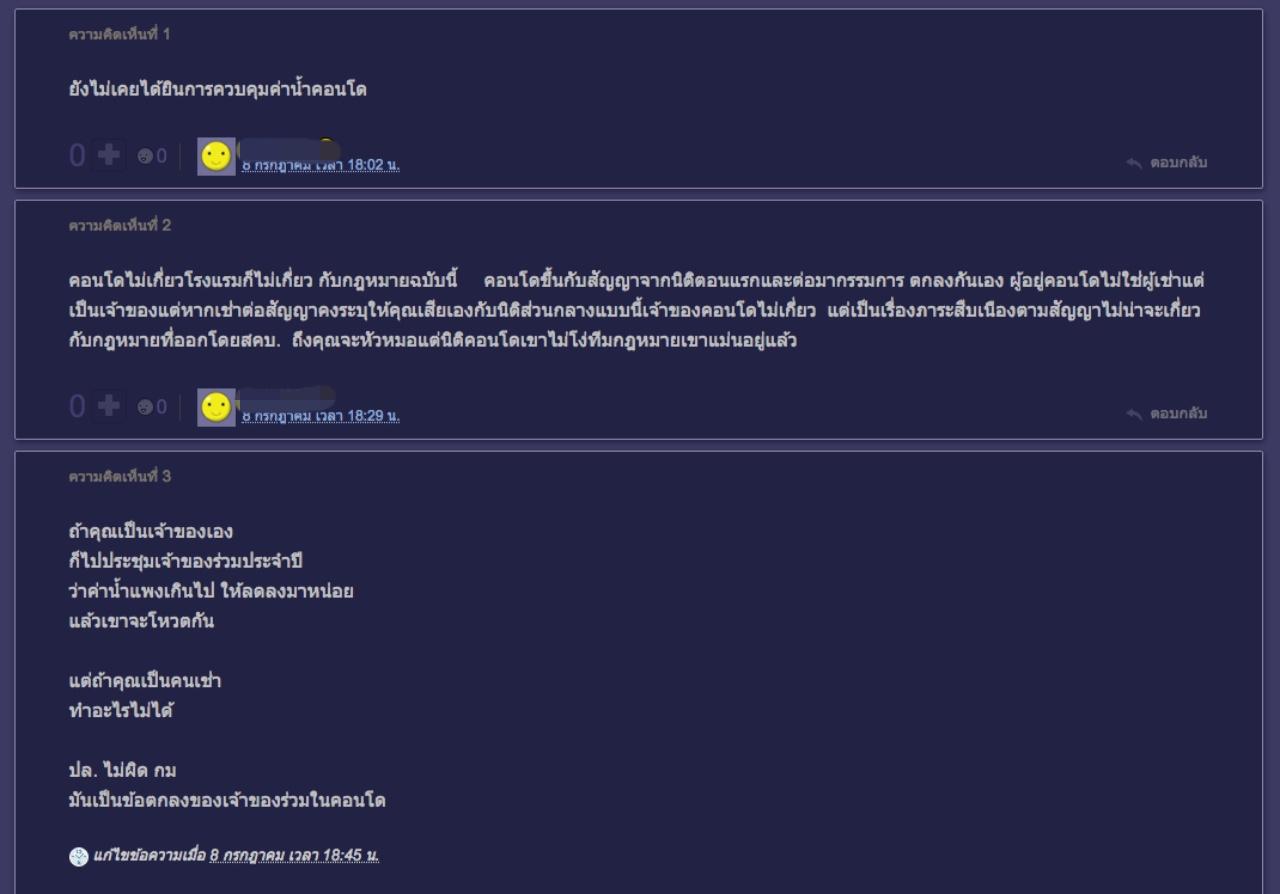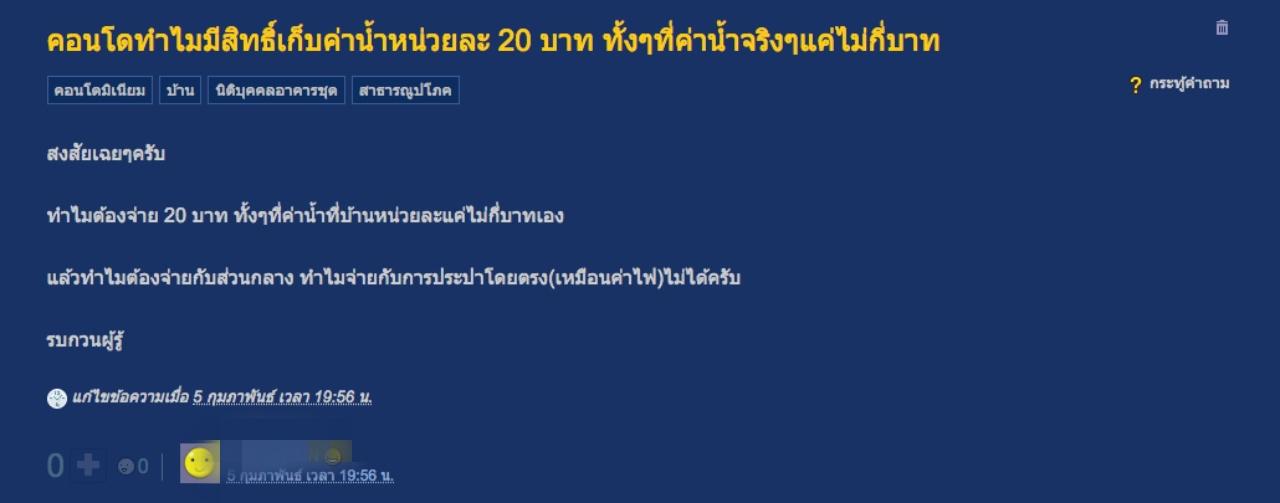 “ถามว่าลูกบ้านโวยวายมั้ย..เราจัดประชุมลูกบ้าน ลูกบ้านคนไหนถามว่าทำไมค่าน้ำที่นี่แพงกว่า กทม. เราก็เอาข้อมูลของ กปภ. มาให้ดูเลยว่า กปภ.จดมิเตอร์หน้าโครงการเท่าไหร่.. เขาเก็บ 15 บาทแล้ว เราจะมาเก็บ 15 บาทได้อย่างไร เพราะน้ำส่วนกลางถึงเวลาก็ต้องถ่ายออก แบบนี้ใครจ่าย นิติบุคคลก็ต้องจ่าย และยังค่าอื่นๆ ที่กล่าวมาข้างต้นอีก..”