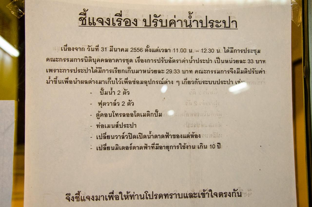 โครงการที่ผมอยู่ เมื่อก่อนเคยเก็บที่หน่วยละ 15 บาท แต่เจ้าของโครงการบอกไม่ได้ล่ะ เราจำเป็นต้องปรับเพิ่ม เพราะเงินเฟ้อ การประปาเรียกเก็บค่าน้ำสูงขึ้น ปัจจุบันนี้จ่ายหน่วยละ 25 บาท แล้วใน กทม. เป็นแบบนี้... แต่สำหรับคอนโดในต่างจังหวัด ตัวผมเองทำคอนโดมิเนียมที่ จ.ชลบุรี และระยอง ถ้าเก็บค่าน้ำหน่วยละ 25 บาท “ผมเจ๊งเลย”