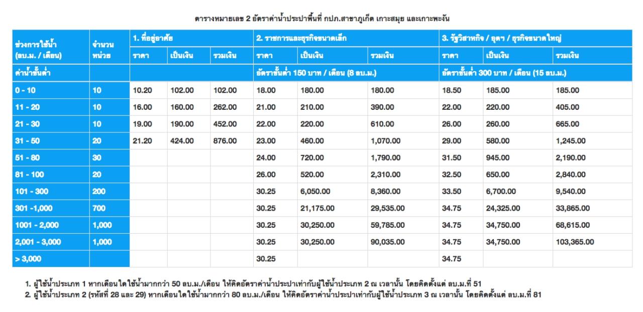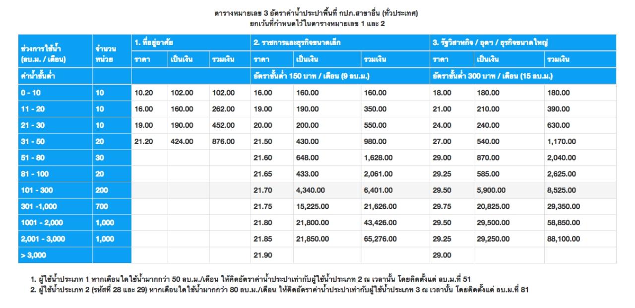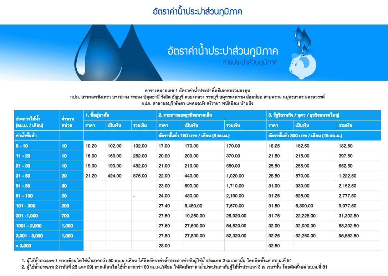 ขณะที่ การประปาส่วนภูมิภาค นั้นจะมีการคิดอัตราค่าน้ำแบ่งออกเป็น 3 ประเภท คือ 1.ที่อยู่อาศัย 2.ราชการและธุรกิจขนาดเล็ก และ 3.รัฐวิสาหกิจ/อุตสาหกรรม และธุรกิจขนาดใหญ่ ซึ่งราคาก็แตกต่างกัน แน่นอน สำหรับอัตราที่อยู่อาศัยจะถูกกว่า ส่วนประเภทที่ 2 และ 3 จะแพงกว่า ไล่ระดับตามการใช้น้ำ (ดูจากภาพได้เลย) ซึ่งจะเห็นได้ว่าราคาจาก กปภ. จะแพงกว่าของ กปน. โดยเริ่มต้นเก็บที่ 10.20 บาท ต่อหน่วยสำหรับที่อยู่อาศัยทั่วไป ซึ่งก็แสดงให้เห็นว่าคนกรุงเทพฯ ใช้น้ำถูกกว่าคนต่างจังหวัด (อัตราค่าน้ำจาก กปภ.)