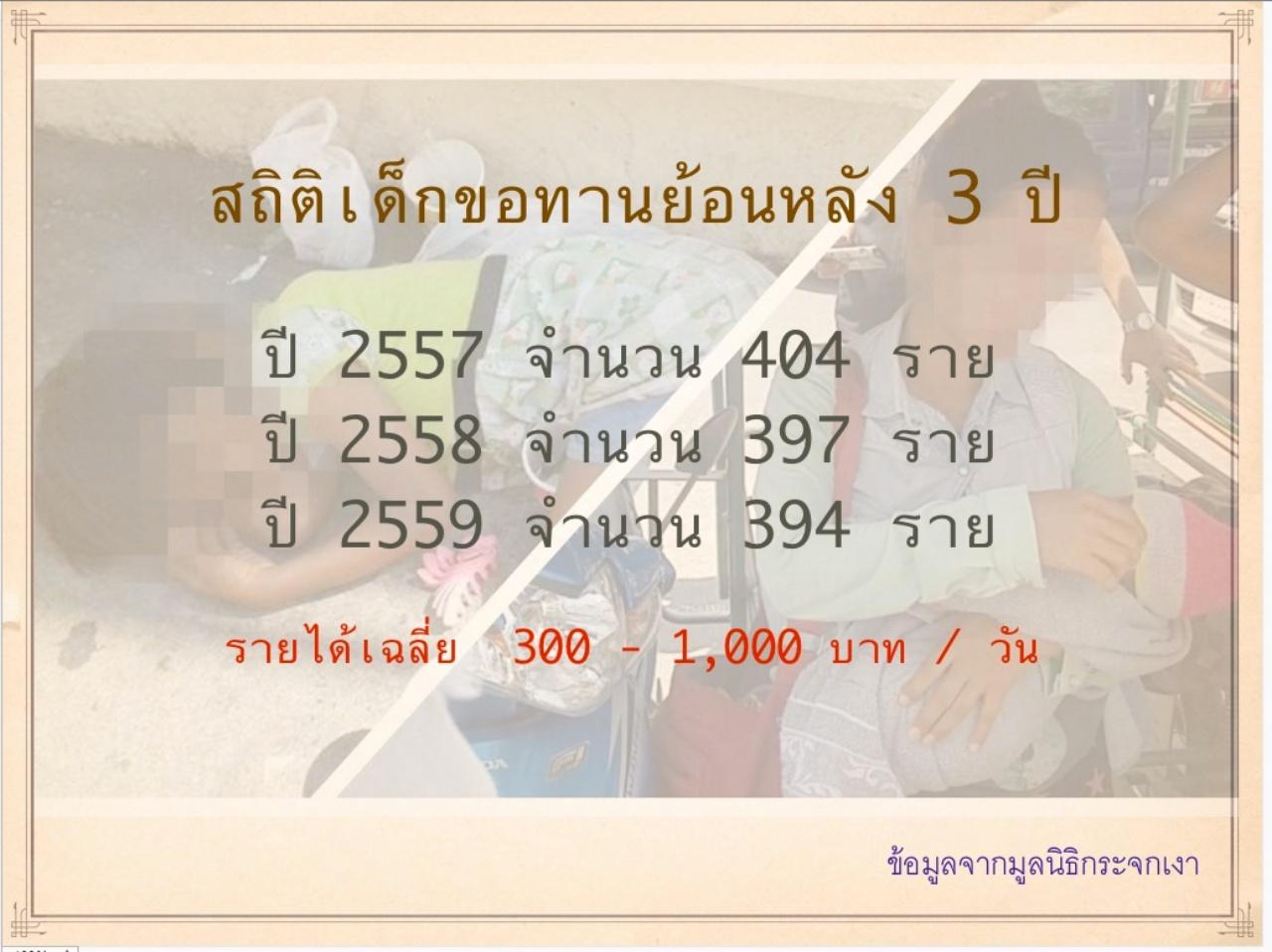 ส่วนข้อมูลจากทางกระจกเงานั้น หัวหน้าโครงการรณรงค์ยุติธุรกิจเด็กขอทาน เปิดเผยว่า พ.ศ.2557 มีเด็กขอทานที่พบทั้งสิ้น 404 ราย, พ.ศ.2558 มี 297 ราย และ พ.ศ.2559 มี 294 ราย สำหรับตัวเลขดังกล่าวนั้น เราไม่สามารถแยกได้ว่าเป็นเด็กไทยหรือต่างชาติ แต่..เด็กขอทานในประเทศเราร้อยละ 80-90 นั้นเป็นเด็กกัมพูชาอยู่แล้ว ที่เป็นแบบนี้คิดว่าเพราะกัมพูชามีปัญหาความยากจน อีกทั้งค่าตอบแทนในการทำงานก็มีรายได้ต่ำมาก ทำให้เกิดการอพยพเข้ามาในประเทศไทย บางกลุ่มมีจุดประสงค์เพื่อขอทาน กอปรกับคนไทยมีค่านิยมต่อการให้เงินเด็กขอทาน ด้วยเหตุนี้ จึงทำให้มีรายได้เฉลี่ยค่อนข้างมาก คือ 300-1,000 บาท