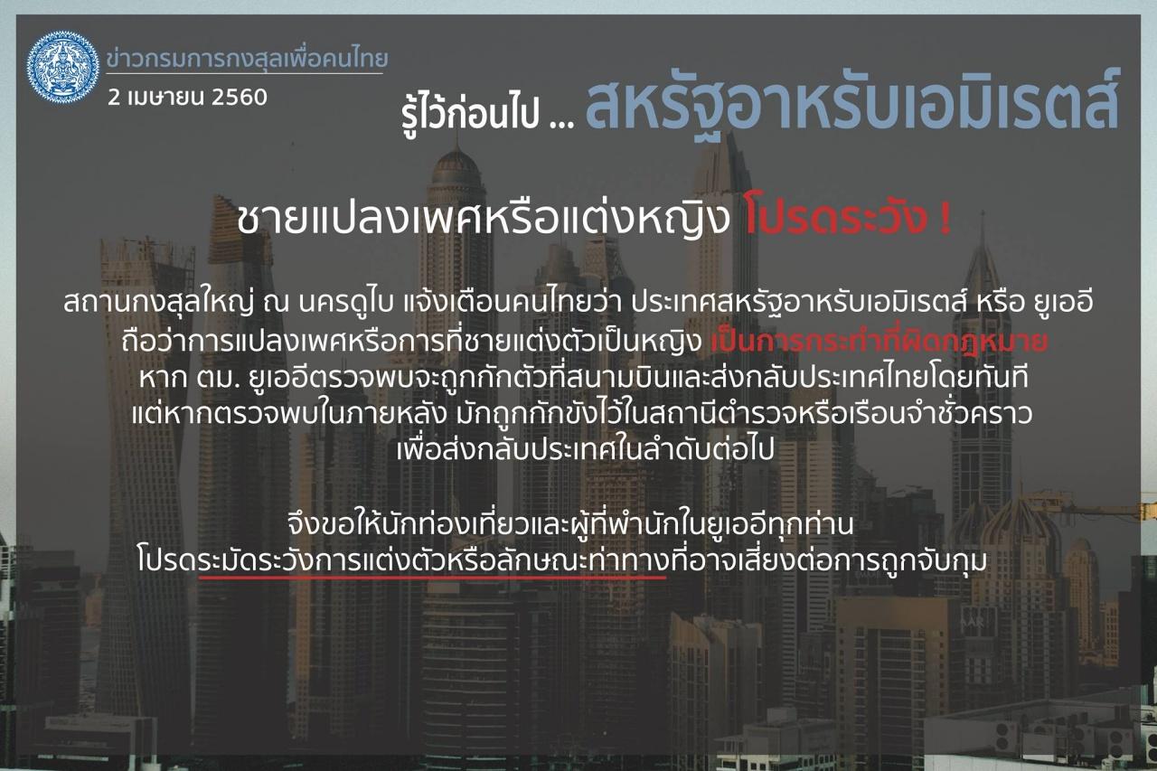 ย้ำอีกครั้ง ห้ามบุคคลแปลงเพศ หรือแต่งกายไม่ตรงกับเพศสภาพ ที่ระบุในหนังสือเดินทาง เดินทางเข้าประเทศสหรัฐอาหรับเอมิเรสต์ หรือหากตรวจพบภายหลัง จะถูกจับกุม และส่งตัวกลับทันที
