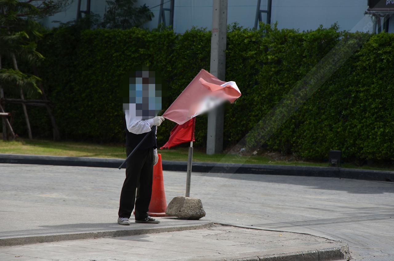“วันไหนไปทำงานไม่ได้ ต้องหาคนมาแทน จะทำงานที่ไหน บริษัทเป็นคนกำหนด เราไม่มีสิทธิ์เลือก ไม่มีข้อกำหนดของบริษัทว่าต้องใช้มือข้างไหนโบกธง เมื่อยก็เปลี่ยนข้างได้ แต่อย่าโบกต่ำเกินเพราะธงจะขาด ต้องระวังรถและคนด้วย เช่น มอ'ไซค์ขี่มาก็ยกธงขึ้นสูงๆ หลบ” เธอพูดไปพร้อมกับสายตาก็กวาดมองรอบ
