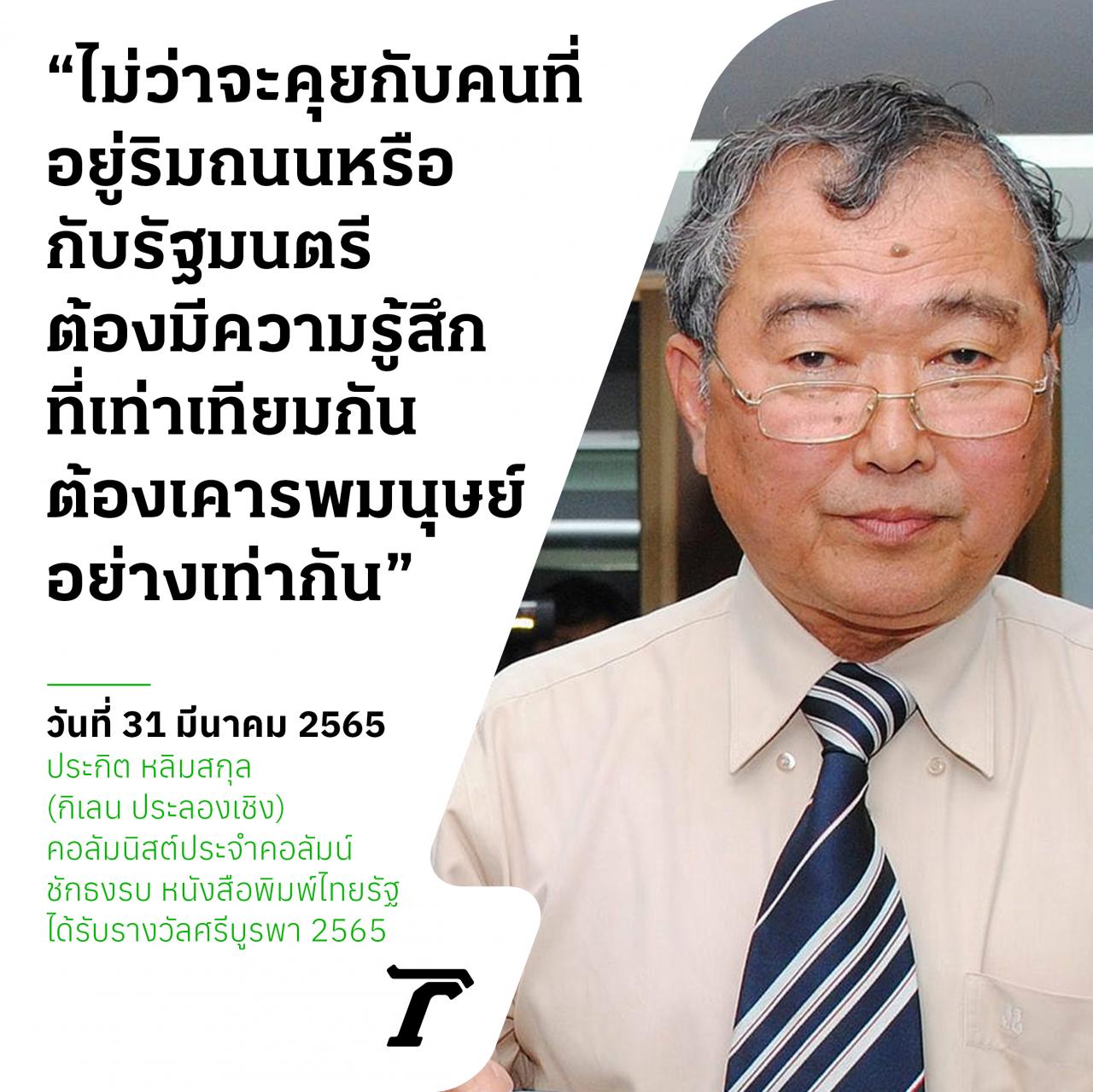 “รางวัลศรีบูรพานั้นมีค่า และไม่ฝันว่าจะมีวันนี้ เพราะรู้ว่าตัวเองมีปมด้อยที่เรียนน้อย แต่เรียนน้อยก็เป็นกู” เป็นประโยคเปิดใจ และเล่าย้อนประวัติ ความเป็นมาบนเส้นทางชีวิตจาก “ประกิต หลิมสกุล หรือ กิเลน ประลองเชิง” คอลัมนิสต์ประจำคอลัมน์ ชักธงรบ หนังสือพิมพ์ไทยรัฐ เมื่อถูกถามถึงความรู้สึกกับรางวัลล่าสุด “รางวัลศรีบูรพา 2565”