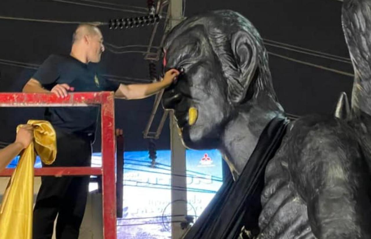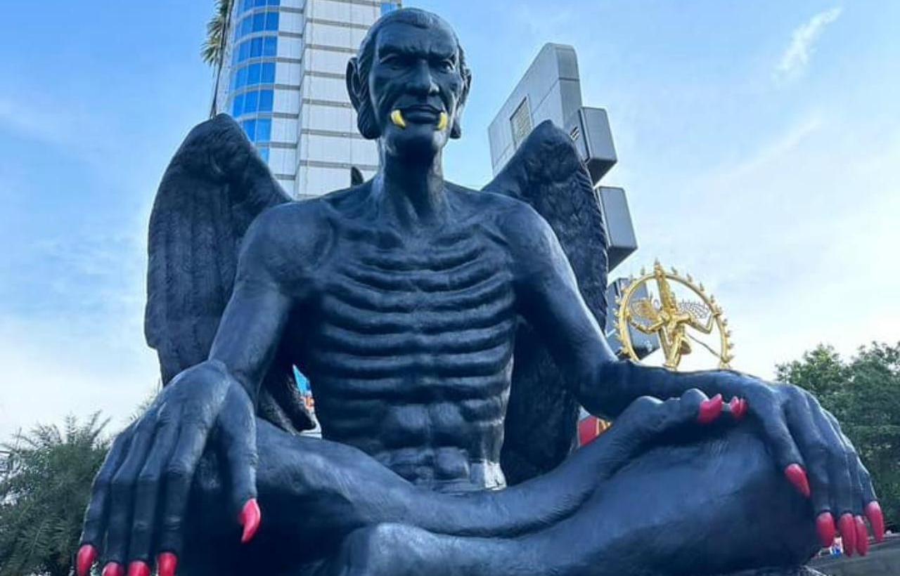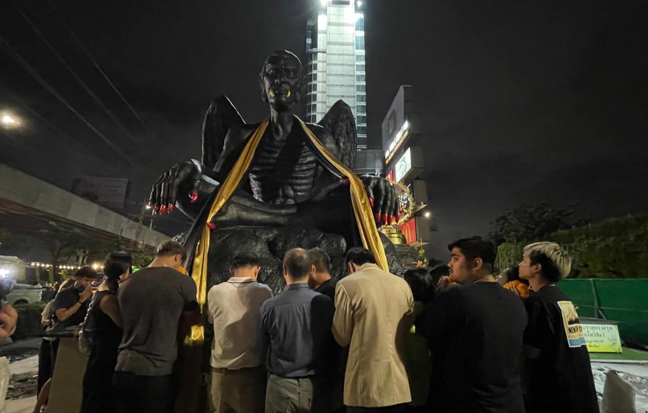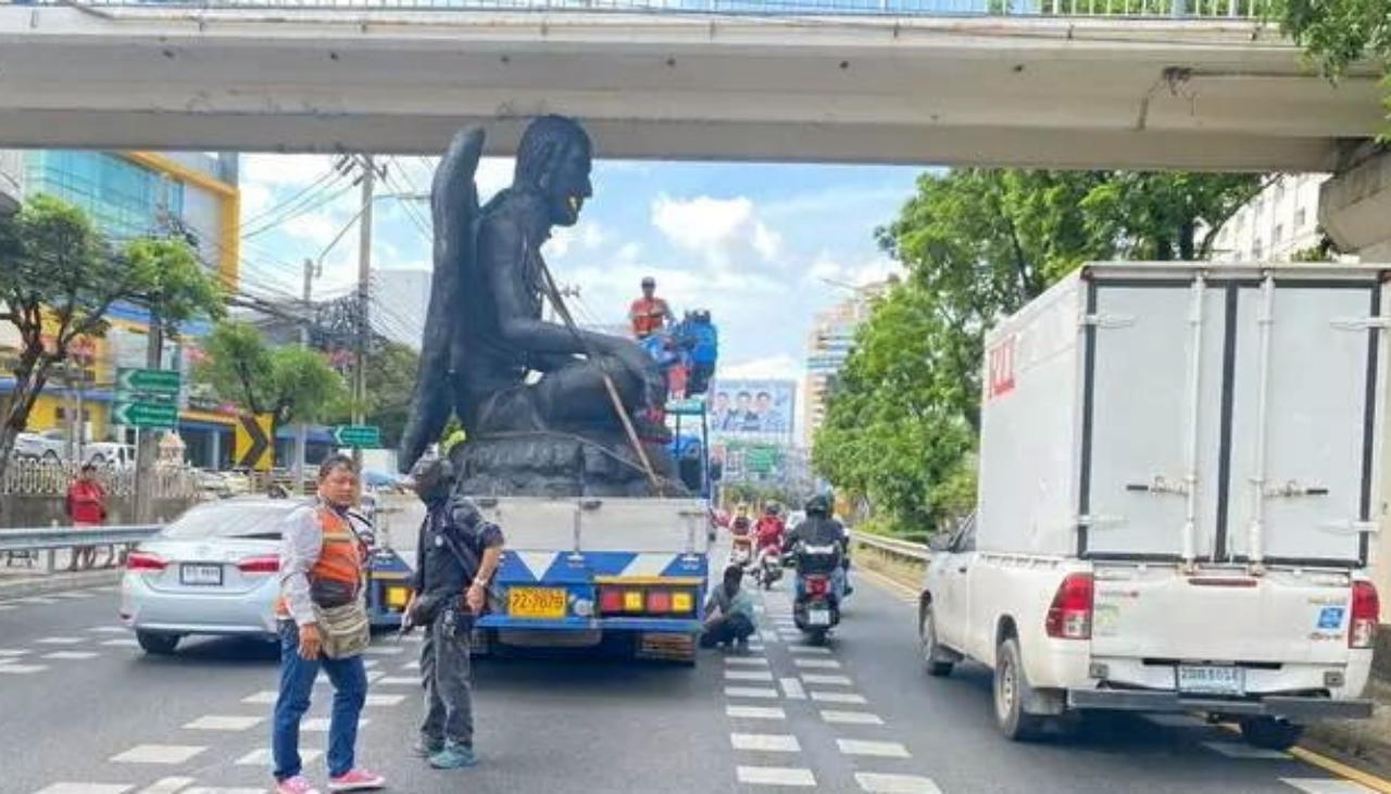 เหตุเมื่อช่วงเช้าวันที่ 9 ส.ค. 2566 การจราจรติดขัดอย่างหนักบนถนนรัชดาภิเษกขาเข้า รถติดสะสมยาวไปถึงสะพานพระราม 7 เนื่องจากรถเครน 6 ล้อ บรรทุกรูปปั้นขนาดใหญ่มหึมาติดคาอยู่สะพานลอยคนข้าม ไม่สามารถผ่านไปได้ ขณะที่คนสัญจรไปมาต่างตกตะลึง และสงสัยว่ารูปปั้นขนาดใหญ่สีดำ คล้ายมนุษย์ผู้ชายวัยชราในท่านั่ง มือทั้งสองข้างวางบนเข่า มีปีกอยู่ด้านหลัง มีเขี้ยวสีทอง และเล็บยาวสีแดง คืออะไร พร้อมกับหยิบมือถือถ่ายรูปและคลิป จนกลายเป็นไวรัลสร้างความฮือฮาในโลกโซเชียล