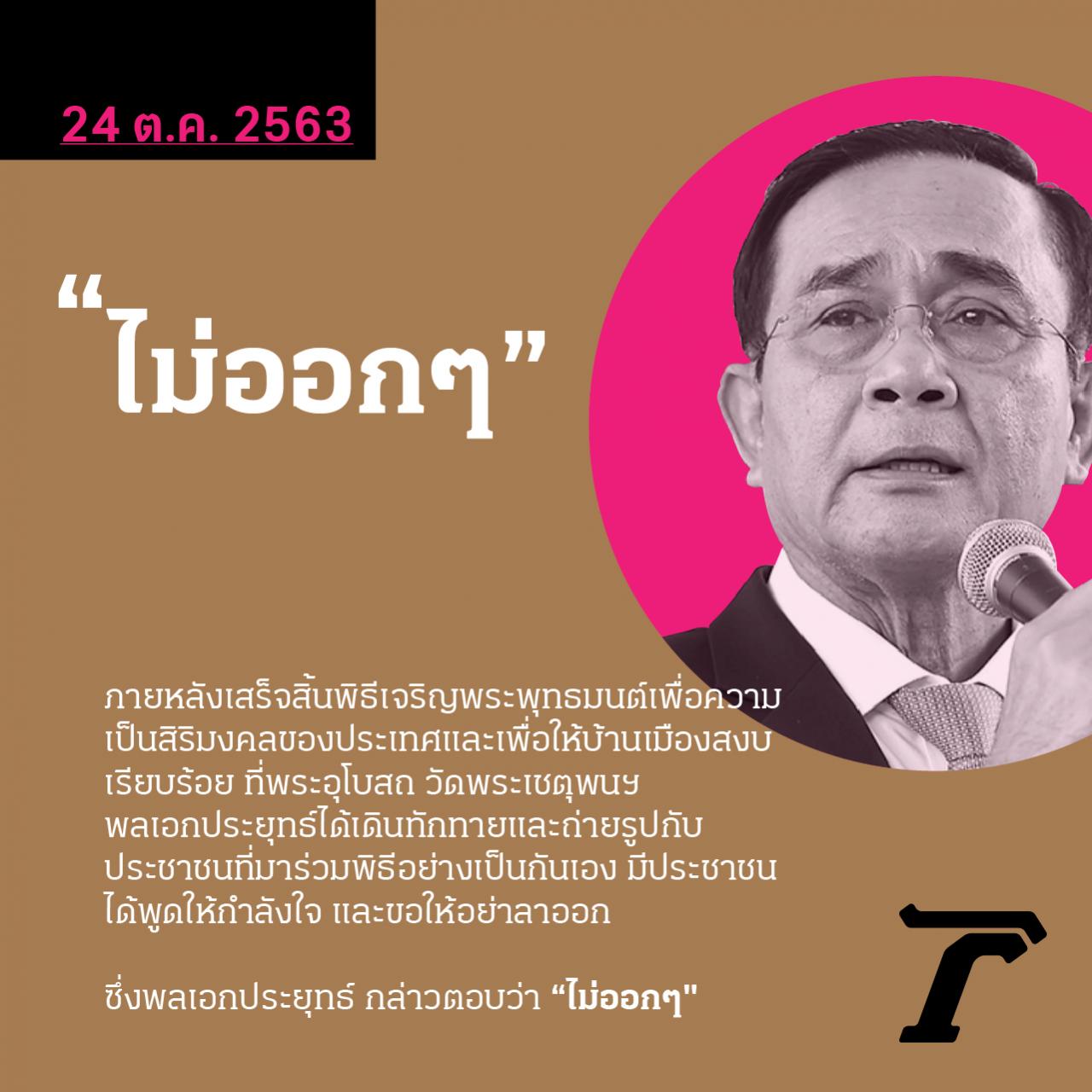 ท่ามกลางการเคลื่อนไหวของผู้ชุมนุมที่มีอยู่อย่างต่อเนื่อง หลังสลายการชุมนุม ภายหลังเสร็จสิ้นพิธีเจริญพระพุทธมนต์ เพื่อความเป็นสิริมงคลของประเทศและเพื่อให้บ้านเมืองสงบเรียบร้อย ที่พระอุโบสถ วัดพระเชตุพนวิมลมังคลาราม เมื่อวันที่ 24 ต.ค. 2563 พลเอกประยุทธ์ ได้เดินทักทายและถ่ายรูปกับประชาชนที่มาร่วมพิธีอย่างเป็นกันเอง และมีประชาชนได้พูดให้กำลังใจ และขอให้อย่าลาออก ซึ่งพลเอกประยุทธ์ กล่าวตอบว่า “ไม่ออกๆ”