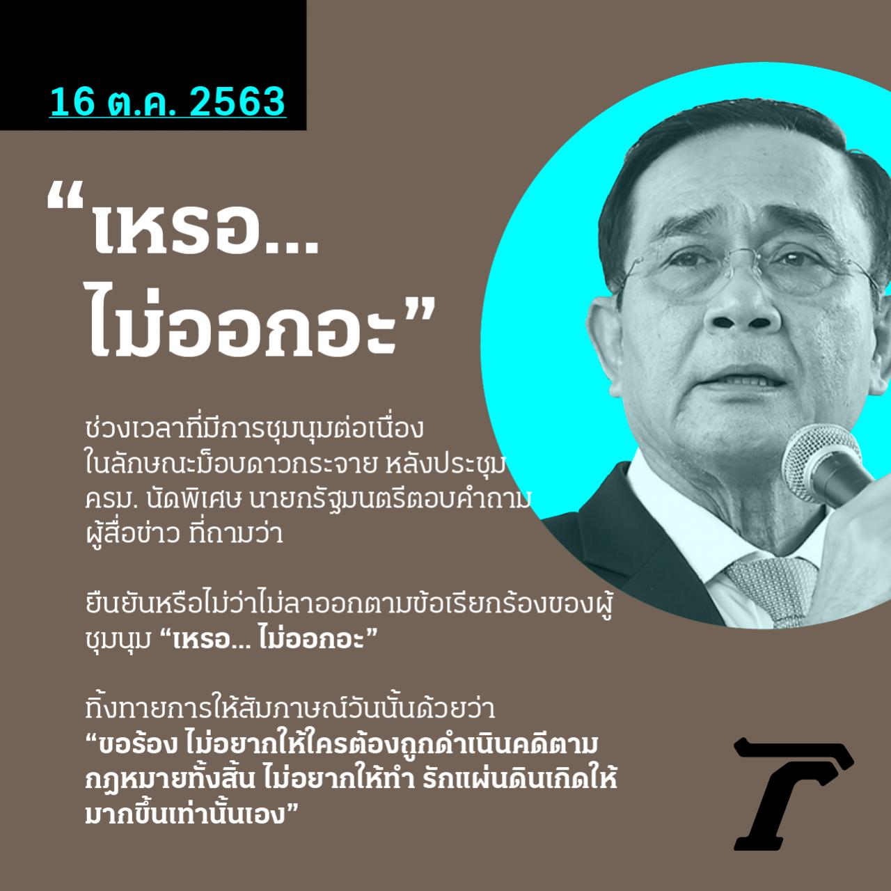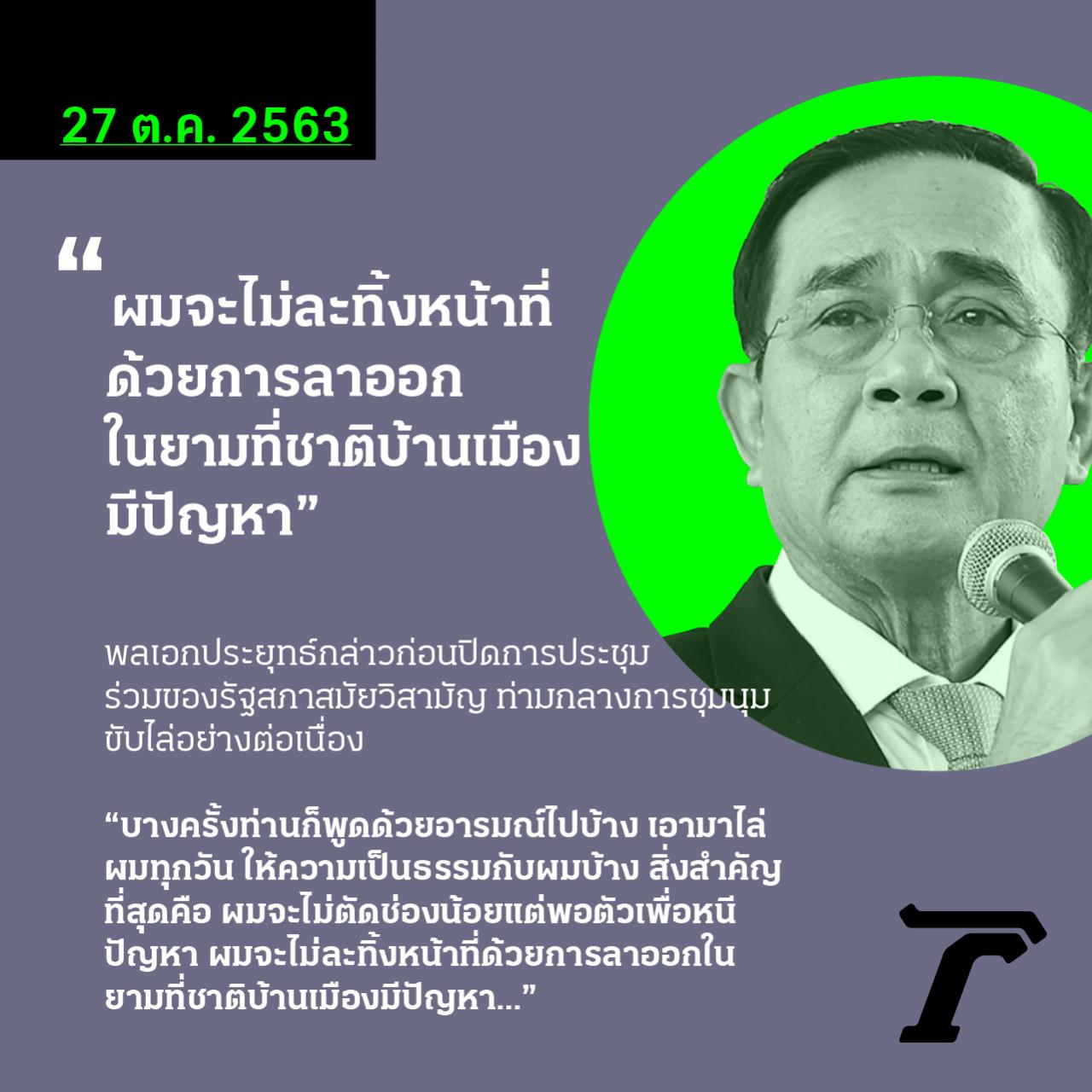 27 ต.ค. 2563 “ผมจะไม่ละทิ้งหน้าที่ด้วยการลาออกในยามที่ชาติบ้านเมืองมีปัญหา”