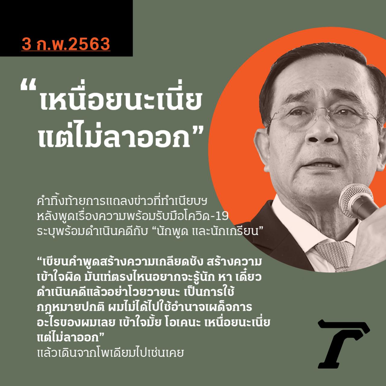 ต้นปี 2563 โรคระบาดโควิด-19 เริ่มกำลังลุกลามจากจีนไปหลายประเทศ รวมทั้งไทย ในวันที่ 3 ก.พ. 2563 คำทิ้งท้ายที่พลเอกประยุทธ์กล่าวปิดจบการแถลงข่าวที่ทำเนียบรัฐบาล หลังพูดเรื่องความพร้อมรับมือโควิด-19 ก็ได้ระบุถึงความพร้อมดำเนินคดีกับ “นักพูด และนักเกรียน” ด้วยประโยคที่ว่า