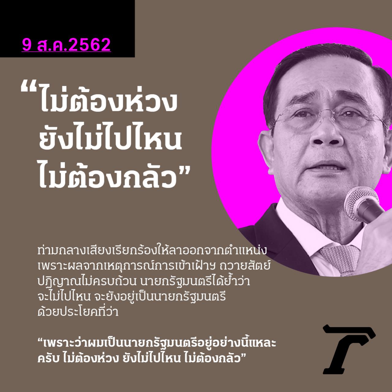 แม้พลเอกประยุทธ์ จันทร์โอชา ได้ชื่อว่าเป็นนายกรัฐมนตรี หลังจากผ่านอีเวนต์เลือกตั้งวันที่ 24 มีนาคม 2562 แล้ว แต่หลังจากนั้นกลับมีการเรียกร้องให้พลเอกประยุทธ์ลาออกจากตำแหน่งเป็นระยะ แต่คำพูดที่ชัดเจนออกจากปากเสมอคือ “ไม่ลาออก” หากไล่เรียงแต่ละช่วงเวลาและเหตุการณ์ที่ทำให้พลเอกประยุทธ์ออกมาย้ำว่า “ไม่ลาออก” หรือ “ไม่ไปไหน” นั้นเกิดขึ้นครั้งสำคัญๆ ดังนี้