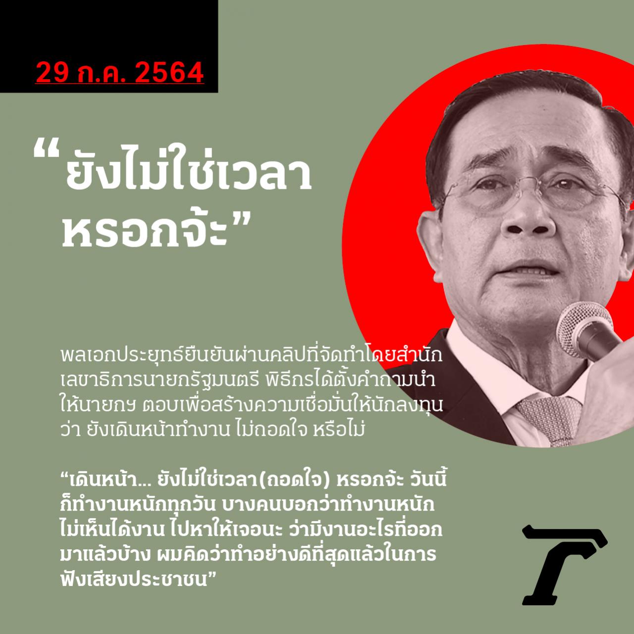การชุมนุมขับไล่พลเอกประยุทธ์ออกจากตำแหน่งเว้นวรรคไประยะหนึ่งด้วยสถานการณ์โรคระบาดหนัก และแกนนำบางส่วนเข้าเรือนจำ แต่เพราะการควบคุมโรคระบาดไร้ประสิทธิภาพ และการจัดหาวัคซีนที่ปรับเปลี่ยนตามสถานการณ์ เต็มไปด้วยข้อสงสัย ทำให้กลุ่มผู้ชุมนุมกลับมาอีกครั้ง และเป็นครั้งล่าสุดที่พลเอกประยุทธ์ยืนยันว่ายังคงเดินหน้าทำงาน เป็นการกล่าวผ่านคลิปวิดีโอที่จัดทำโดยสำนักโฆษก สำนักเลขาธิการนายกรัฐมนตรี เผยแพร่ในยูทูบของทำเนียบรัฐบาล ความยาว 36 นาที เมื่อวันที่ 29 ก.ค. 2564 โดยในช่วงประมาณนาทีที่ 15 ของคลิปดังกล่าว พิธีกรได้ตั้งคำถามนำให้นายกรัฐมนตรีตอบเพื่อสร้างความเชื่อมั่นให้นักลงทุนว่า ยังเดินหน้าทำงาน ไม่ถอดใจหรือไม่