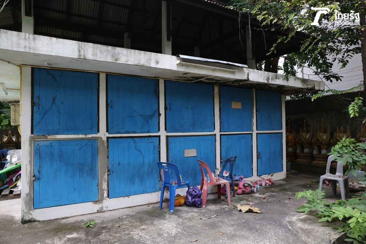 จากหน้าวัดสู่ท้ายวัด บริเวณ “ศาลาสันติสุข” โกดังเก็บศพ กลิ่นคาวคลุ้งราวกวักมือเรียกให้ทุกคนไปหยุดยืน หน้าช่องเก็บศพ ที่ก่ออิฐถือปูนสองชั้น แบ่งช่องขนาดกว้างยาวขนาดพอดีกับหีบศพ โดยทั้งหมดมี 20 ช่อง