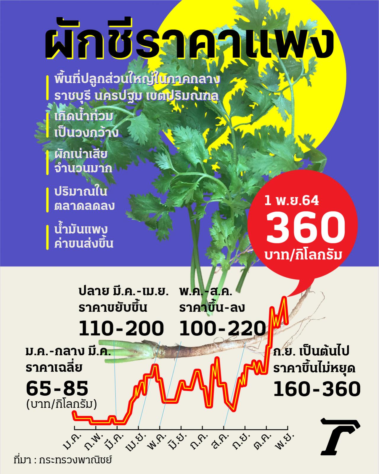 เพราะผลผลิตออกสู่ตลาดน้อยลง และพื้นที่ปลูกส่วนใหญ่อยู่ในภาคกลาง ซึ่งเกิดอุทกภัยเป็นวงกว้าง ทำให้ผักชีที่ปลูกเน่าเสียหายจากน้ำท่วมขัง อีกทั้งเมื่อน้ำมันแพงขึ้น ส่งผลให้ค่าขนส่งปรับขึ้น กลายเป็นว่าผู้บริโภคต้องแบกรับภาระหนัก ร้านอาหารไม่มีทางเลือกอื่นต้องกัดฟันซื้อวัตถุดิบพวกพืชผักในราคาแพงขึ้นกว่าเดิม หวังการเปิดประเทศจะทำให้การค้าขายดีขึ้น แต่อาจไม่ใช่เช่นนั้น เพราะต้นทุนเพิ่มขึ้น กำไรลดลง แล้วคนไทยจะอยู่อย่างไรต่อไป.