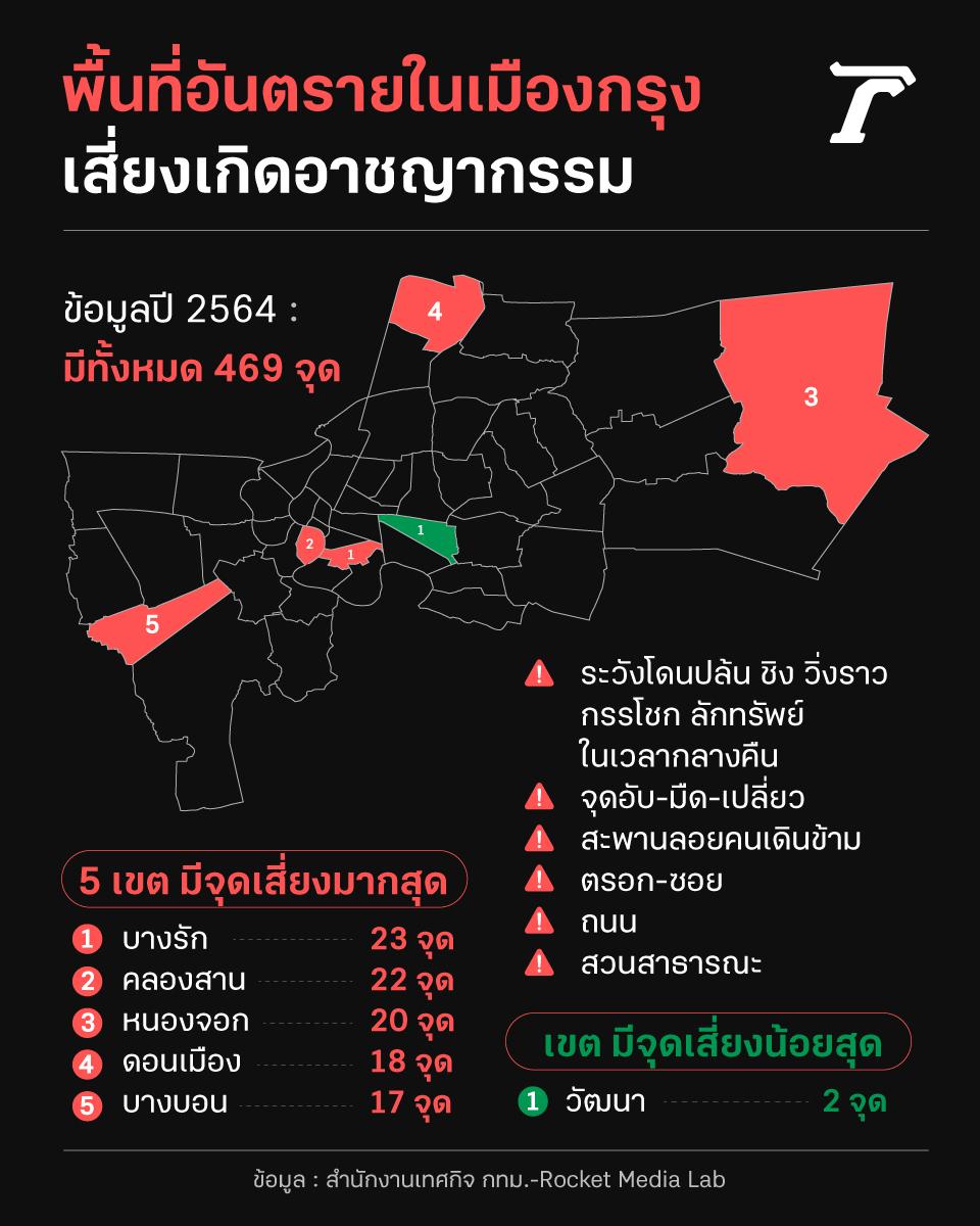 ข้อมูลบัญชีพื้นที่เสี่ยงและพื้นที่อันตรายของกทม. ประจำปี 2564 ของสำนักงานเทศกิจ กทม. พบว่ามีจุดเสี่ยงทั้งหมด 469 จุด โดยเขตที่มีจุดเสี่ยงมากที่สุด 5 อันดับแรก ได้แก่ บางรัก 23 จุด คลองสาน 22 จุด หนองจอก 20 จุด ดอนเมือง 18 จุด และบางบอน 17 จุด