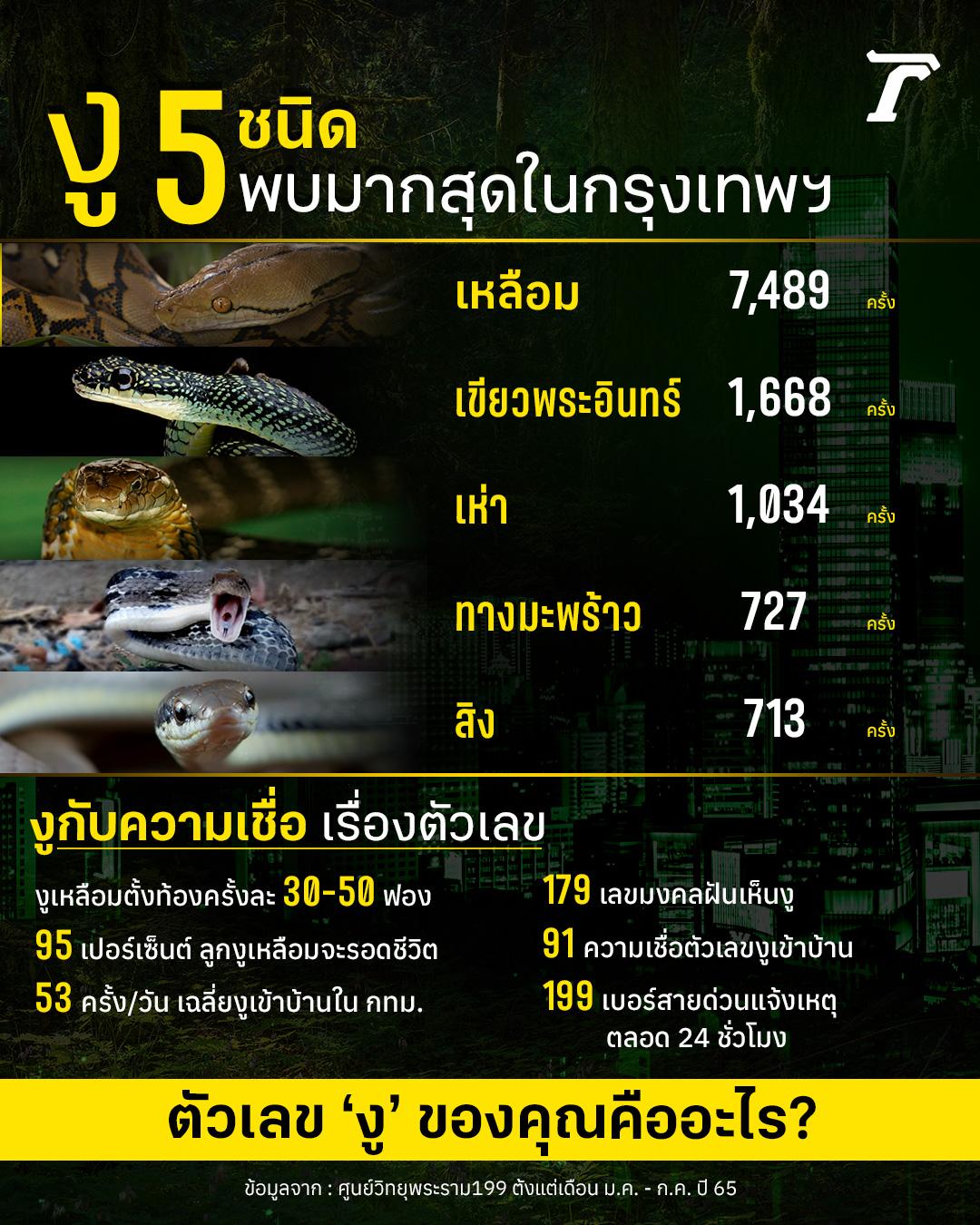 สำหรับสถิติการแจ้งเหตุงูเข้าบ้านในพื้นที่กรุงเทพฯ จากศูนย์วิทยุพระราม 199 ตั้งแต่เดือนมกราคม-กรกฎาคม ปี 2565 มีการแจ้งเหตุงูเหลือมเข้าบ้าน 7,489 ครั้ง รองลงมาเป็นงูเขียวพระอินทร์ 1,668 ครั้ง และงูเห่า 1,034 ครั้ง