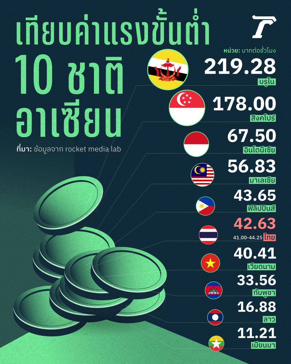 หากเทียบค่าแรงขั้นต่ำต่อชั่วโมงของไทย จากการทำงานวันละ 8 ชั่วโมง กับประเทศในอาเซียน ไทยอยู่อันดับที่ 6 เฉลี่ย 41-44.25 บาทต่อชั่วโมง ขณะที่ บรูไน ค่าแรงสูงสุดอยู่ที่ 219.28 บาทต่อชั่วโมง หรือวันละ 1,754.24 บาท ส่วนลาว อยู่ที่ 16.88 บาทต่อชั่วโมง หรือวันละ 135.04 บาท และเมียนมา ค่าแรงต่ำที่สุดในอาเซียน 11.21 บาทต่อชั่วโมง หรือวันละ 86.68 บาทเท่านั้น