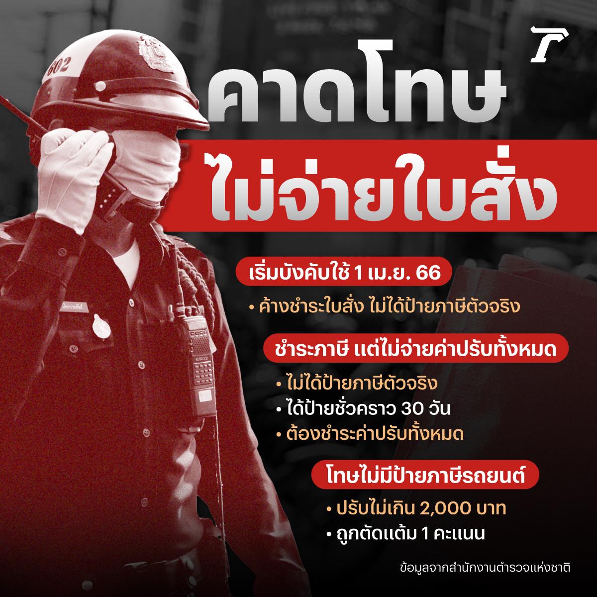 พล.ต.ต.อาชยน ไกรทอง โฆษก ตร. กล่าวว่า ขอย้ำเตือนผู้ขับขี่ที่มีใบสั่งค้างชำระ ตั้งแต่วันที่ 1 เม.ย. 2566 เป็นต้นไป เมื่อไปต่อภาษีรถยนต์ประจำปี นายทะเบียนรถยนต์จะไม่ออกเครื่องหมายแสดงการเสียภาษีประจำปี หรือ ป้ายภาษี ให้ ผู้ขับขี่ที่ค้างชำระค่าปรับ แต่จะได้ใบแทนเสียภาษีชั่วคราว แทนใบจริง จนกว่าจะชำระค่าปรับให้ครบถ้วน ภายใน 30 วัน หลังรับใบแทน