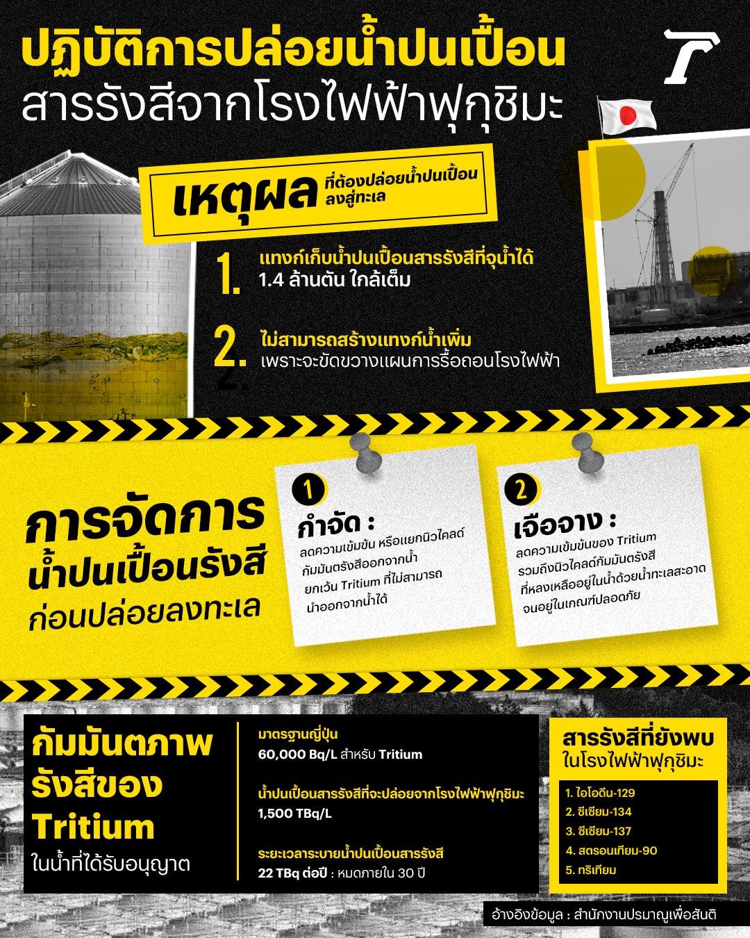 “ที่ตั้งของประเทศญี่ปุ่น อยู่ห่างจากประเทศไทยค่อนข้างมาก ฉะนั้นผลกระทบทางรังสีที่จะมาถึงประเทศไทยจากการปล่อยน้ำปนเปื้อนรังสีในครั้งนี้มีโอกาสน้อยมากจริงๆ อย่างไรก็แล้วแต่สำนักงานปรมาณูเพื่อสันติ (ปส.) ในฐานะหน่วยงานกำกับดูแลความปลอดภัยทางรังสีของประเทศไทย ได้มีการเฝ้าระวัง ติดตาม และตรวจวัดกัมมันตภาพรังสีในสิ่งแวดล้อมทางทะเลของประเทศไทยร่วมกับหน่วยงานเครือข่ายทั้งภายในประเทศและนานาชาติมาอย่างต่อเนื่อง เพื่อยืนยันว่าระบบนิเวศทางทะเลและอาหารทะเลของประทศไทยปราศจากการปนเปื้อนทางรังสีจากการดำเนินงานในครั้งนี้