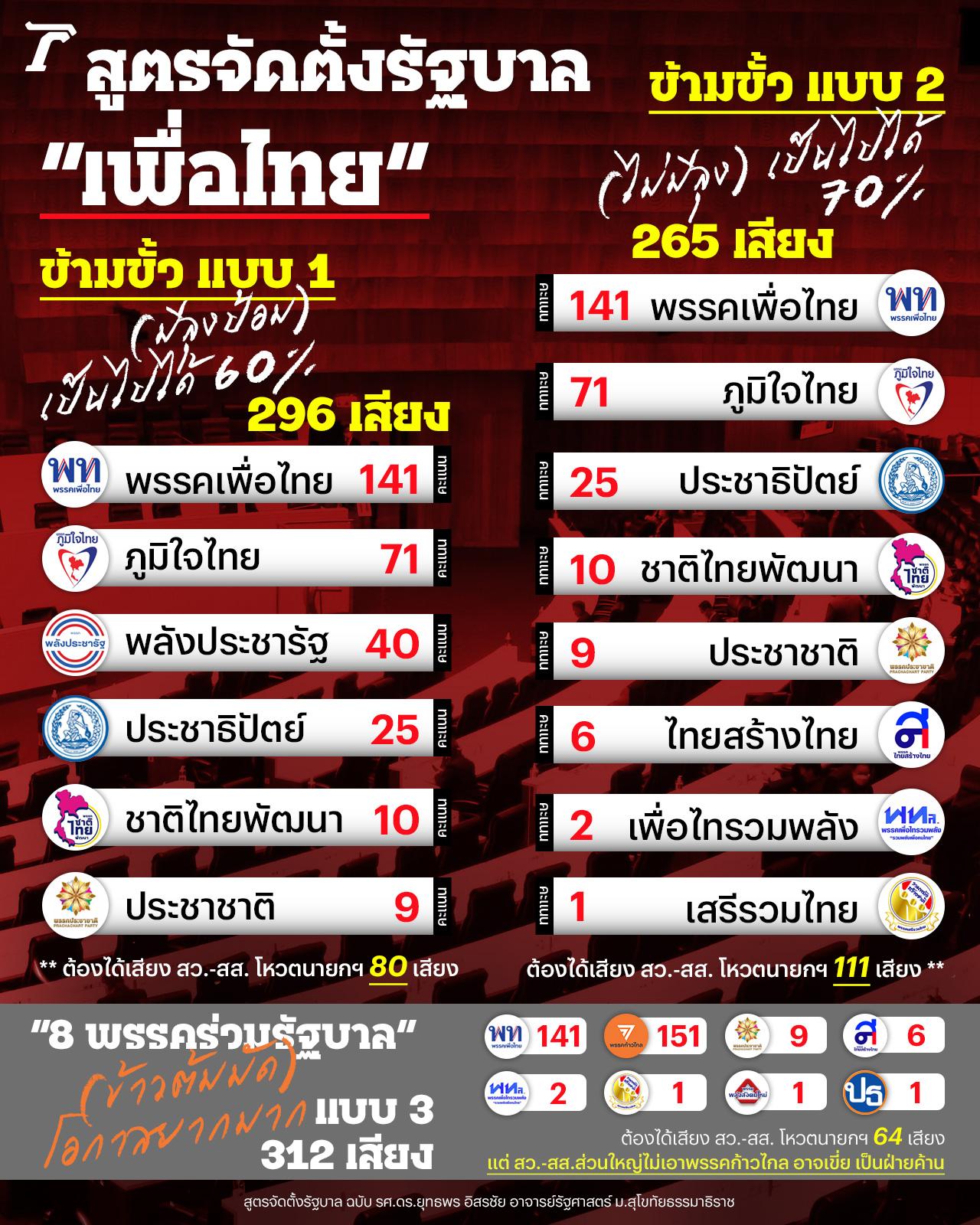 สูตรจัดตั้งรัฐบาล “เพื่อไทยข้ามขั้ว” แบบที่ 2 พรรคเพื่อไทย 141 เสียง รวมกับพรรคภูมิใจไทย 71 เสียง พรรคประชาธิปัตย์ 25 เสียง พรรคชาติไทยพัฒนา 10 เสียง พรรคประชาชาติ 9 เสียง พรรคไทยสร้างไทย 6 เสียง พรรคเพื่อไทรวมพลัง 2 เสียง และพรรคเสรีรวมไทย 1 เสียง รวม 8 พรรค 265 เสียง ซึ่งสูตรนี้พรรคก้าวไกล เป็นฝ่ายค้านเช่นกัน แต่ไม่มี “2 ลุง” และเสียงเกินกึ่งหนึ่งไม่มาก ต้องการเสียง สว.และ สส.โหวตให้เป็นนายกฯ อีก 111 เสียง มีโอกาสเป็นไปได้ 70%