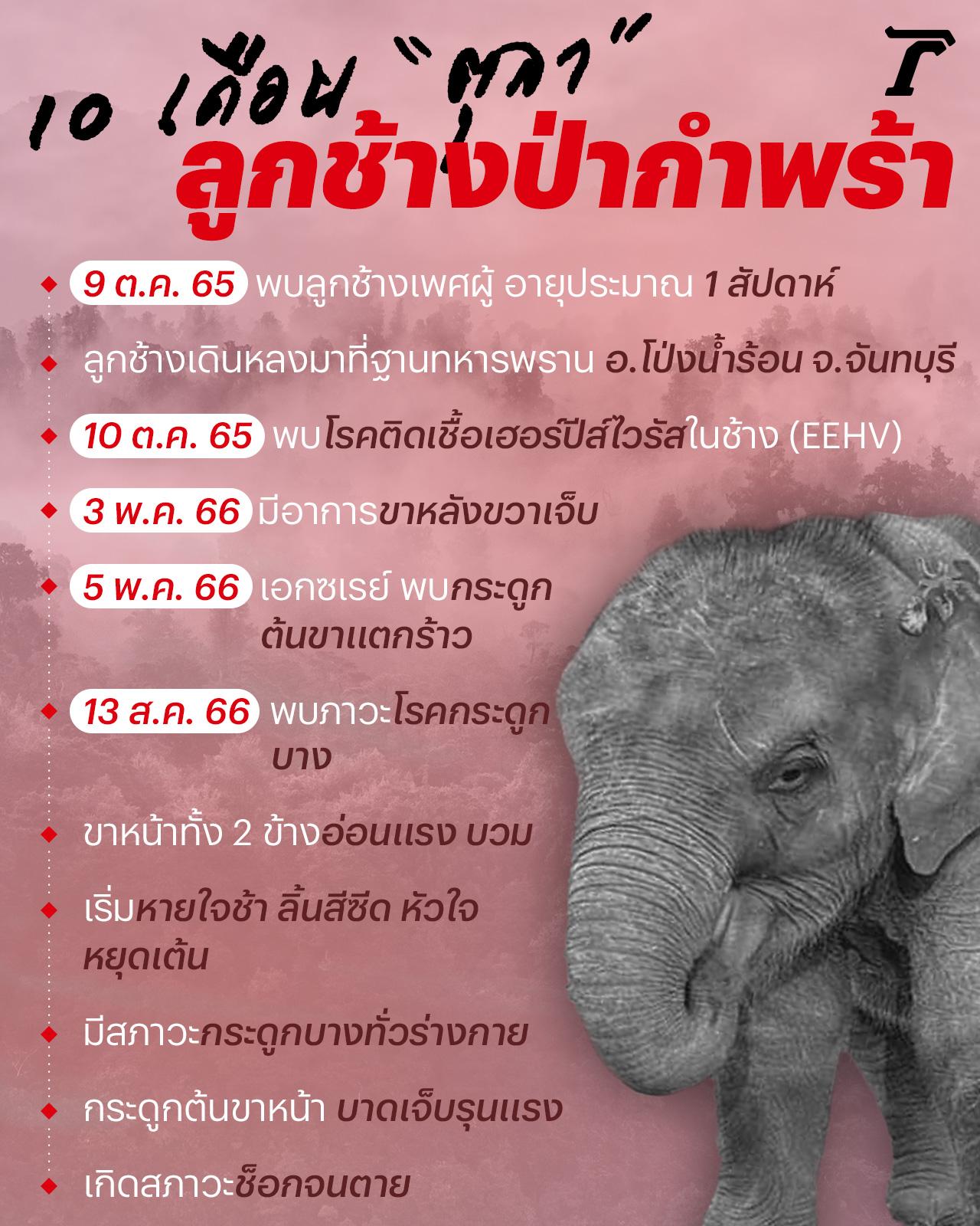 กลายเป็นข่าวเศร้าของคนรักช้าง เมื่อ "ตุลา" ลูกช้างป่ากำพร้า ที่พลัดหลงจากฝูง ได้เสียชีวิตเมื่อวันที่ 13 สิงหาคม ที่ผ่านมา เกิดจากสภาวะช็อกจนตาย เพราะมีอาการกระดูกบางทั่วร่างกาย แม้ก่อนหน้านั้นผู้ที่เกี่ยวข้องจะพยายามดูแลลูกช้าง จนอาการของโรคติดเชื้อหายไป และวางแผนจะปล่อยกลับสู่ป่า แต่น้องกลับมาเสียชีวิตด้วยปัญหาสุขภาพ หากย้อนไทม์ไลน์ 10 เดือน ที่ลูกช้างอยู่ในความดูแล จะเห็นถึงความผูกพันที่ทุกคนมีให้