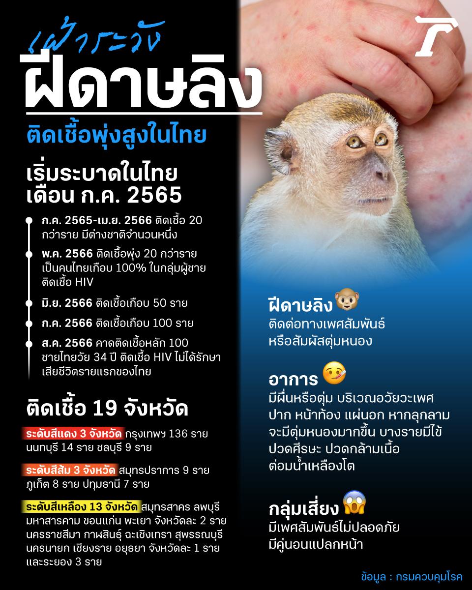 สถานการณ์โรคฝีดาษลิงในไทย ตั้งแต่กลางปี 2566 น่าห่วง เมื่อมีผู้ติดเชื้อเพิ่มขึ้นอย่างรวดเร็วแบบก้าวกระโดดใน 19 จังหวัด เป็นโรคติดต่อทางเพศสัมพันธ์ และการสัมผัสโดยตรงบริเวณผิวหนังที่เป็นตุ่มหนอง โดยเฉพาะกลุ่มติดเชื้อเอชไอวี มีความเสี่ยงที่จะติดเชื้ออย่างต่อเนื่อง ภายหลังเริ่มมีการติดเชื้อฝีดาษลิงในไทย เมื่อเดือน ก.ค. ปี 2565 ส่วนใหญ่เป็นชาวต่างชาติ จนมาในระยะหลังมีผู้ติดเชื้อเป็นคนไทยเกือบ 100% ในกลุ่มชายรักชายไปมีเพศสัมพันธ์ที่ไม่ปลอดภัย หรือมีคู่นอนแปลกหน้า และผู้ติดเชื้อฝีดาษลิงรายใหม่เป็นผู้ติดเชื้อเอชไอวีเกือบครึ่งหนึ่ง ทำให้กรมควบคุมโรคต้องเฝ้าระวัง คาดว่าเดือน ส.ค. น่าจะมีผู้ติดเชื้อหลักร้อยราย