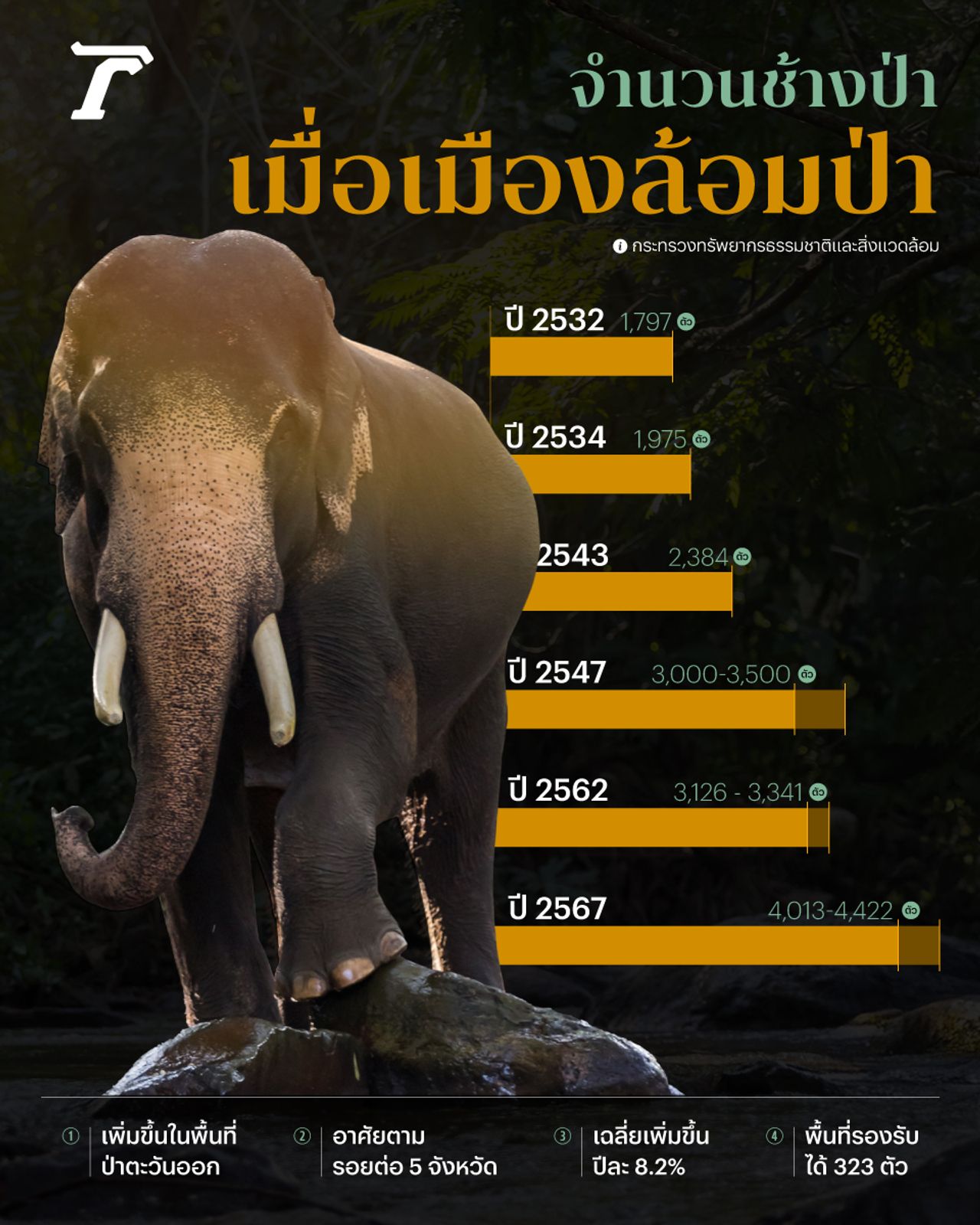 สำรวจจำนวนช้างป่า 35 ปีย้อนหลัง เพิ่มขึ้นต่อเนื่อง โดยเฉพาะป่ารอยต่อ 5 จังหวัด โซนภาคตะวันออก เพิ่มขึ้นปีละ 8.2% เกินศักยภาพพื้นที่รองรับ ซึ่งปี พ.ศ. 2567 มีการประเมินประชากรช้างป่าในพื้นที่กลุ่มป่าตะวันออกไว้ราว 592 ตัว เกินศักยภาพพื้นที่ป่าธรรมชาติที่รองรับได้เพียง 323 ตัว