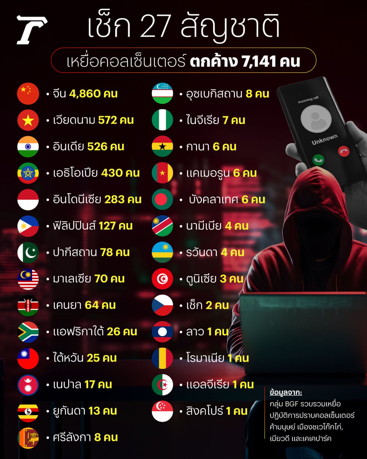 กองกำลัง BGF เปิดสัญชาติเหยื่อแก๊งคอลเซ็นเตอร์ ที่ตกค้างหลังปฏิบัติการกวาดล้างเมือง ชเวโก๊กโก่ เมียวดี และเคเคปาร์ค ประเทศเมียนมา จำนวนทั้งสิ้น 7,141 คน โดยมีการประสานไปถึงสถานทูตประเทศต้นทางเพื่อรับกลับ ขณะที่ก่อนหน้านี้กลุ่มชาติพันธุ์ออกมาให้ข้อมูลถึงภาระหนัก ที่ต้องแบกรับกลุ่มคนที่ตกค้าง และอยากให้ไทย-จีน สนับสนุนเงินส่วนนี้
