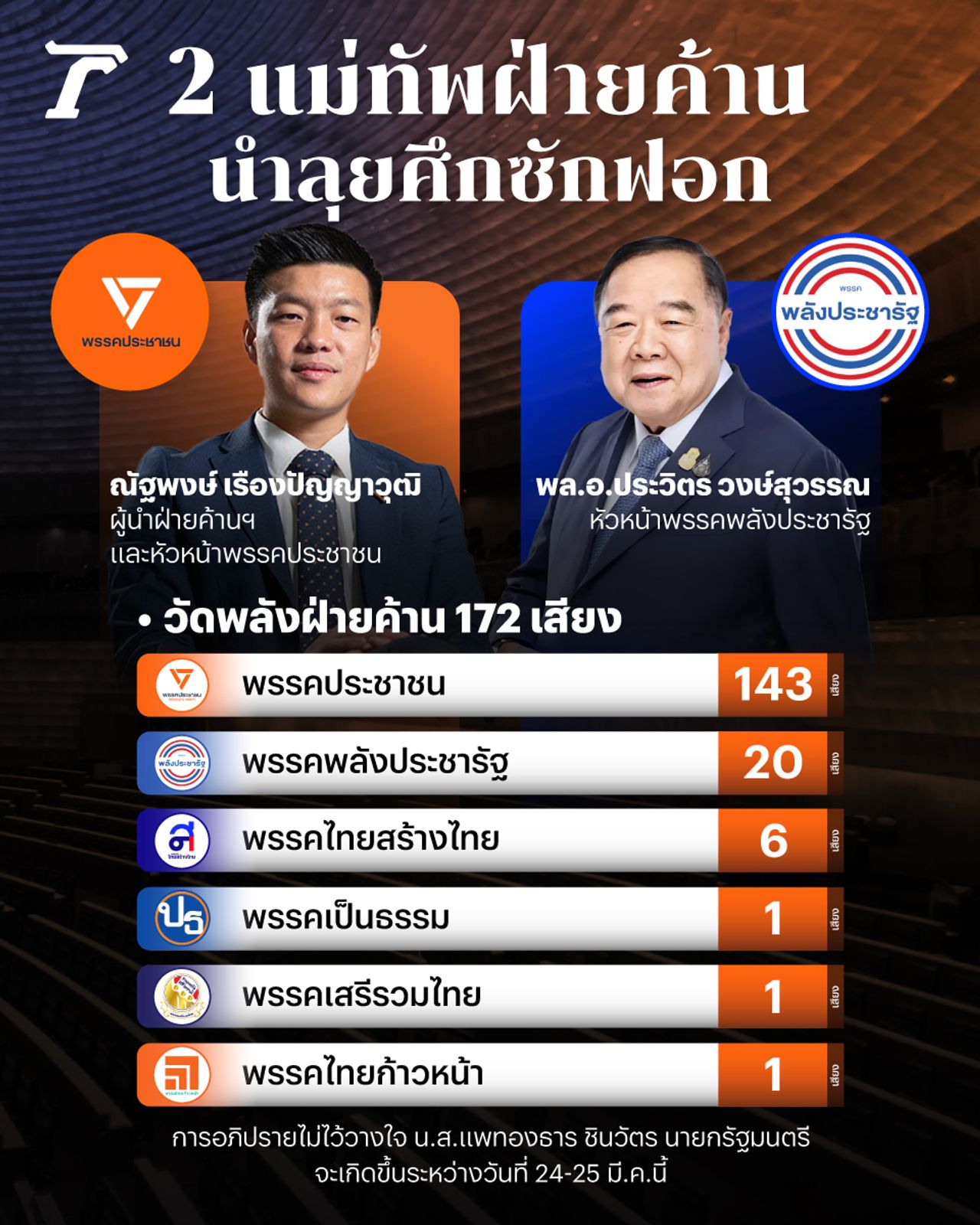 ไหวมั้ย? 2 แม่ทัพ “เท้ง-ป้อม” นำ 172 เสียงพรรคฝ่ายค้าน ลุยศึกซักฟอกเดี่ยวนายกฯ อิ๊งค์ รวม 28 ชั่วโมง ในวันที่ 24-25 มี.ค.นี้ ตั้งแต่ 8 โมงเช้า ยาวถึงตี 5