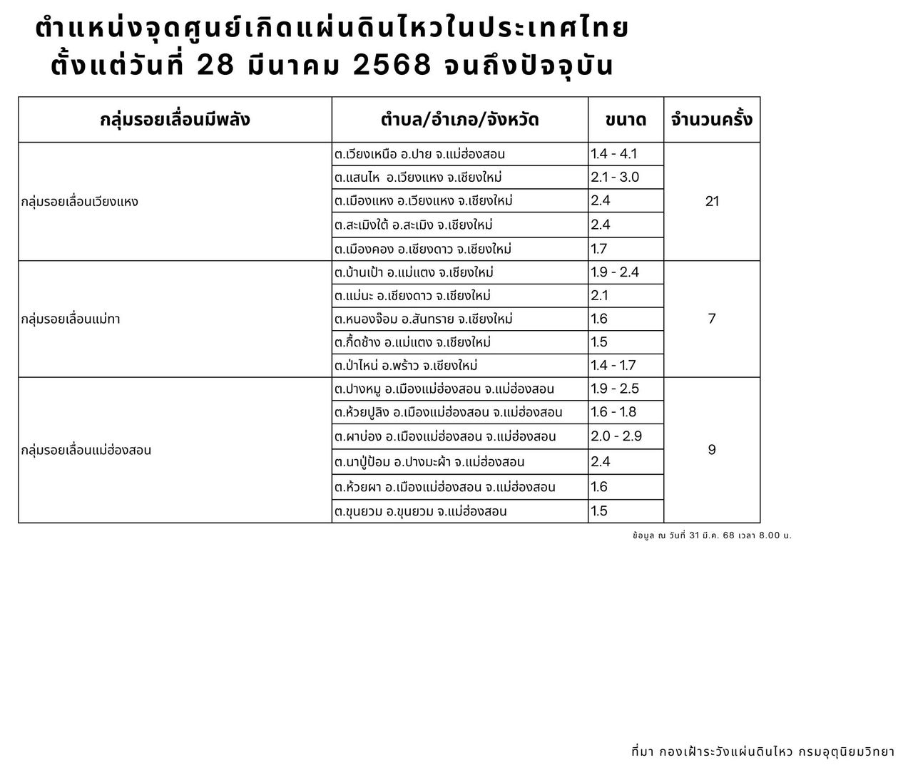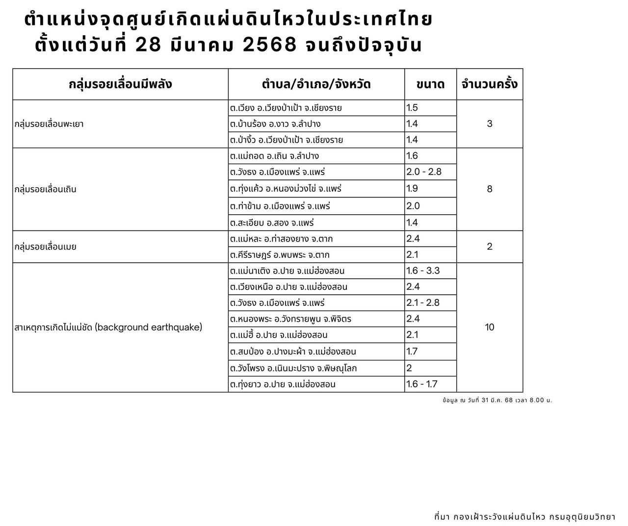 ศูนย์ปฏิบัติการธรณีพิบัติภัย กรมทรัพยากรธรณี เปิดสถิติ 60 เหตุ รอยเลื่อนในไทย ส่งแรงกระเพื่อม หลังเกิดแผ่นดินไหวครั้งใหญ่ในเมียนมา ตั้งแต่วันที่ 28 - 31 มี.ค. 68 (เวลา 8.00 น.) ดังนี้