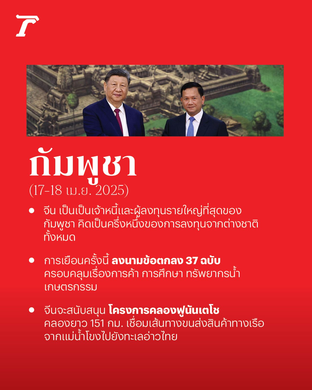 ประธานาธิบดีสี จิ้นผิง เดินทางถึงกรุงพนมเปญ เมืองหลวงของกัมพูชา ในวันที่ 17 เม.ย. และได้พบปะหารือกับสมเด็จฮุน เซน ประธานสภาสูงกัมพูชา และฮุน มาเนต นายกรัฐมนตรีกัมพูชา