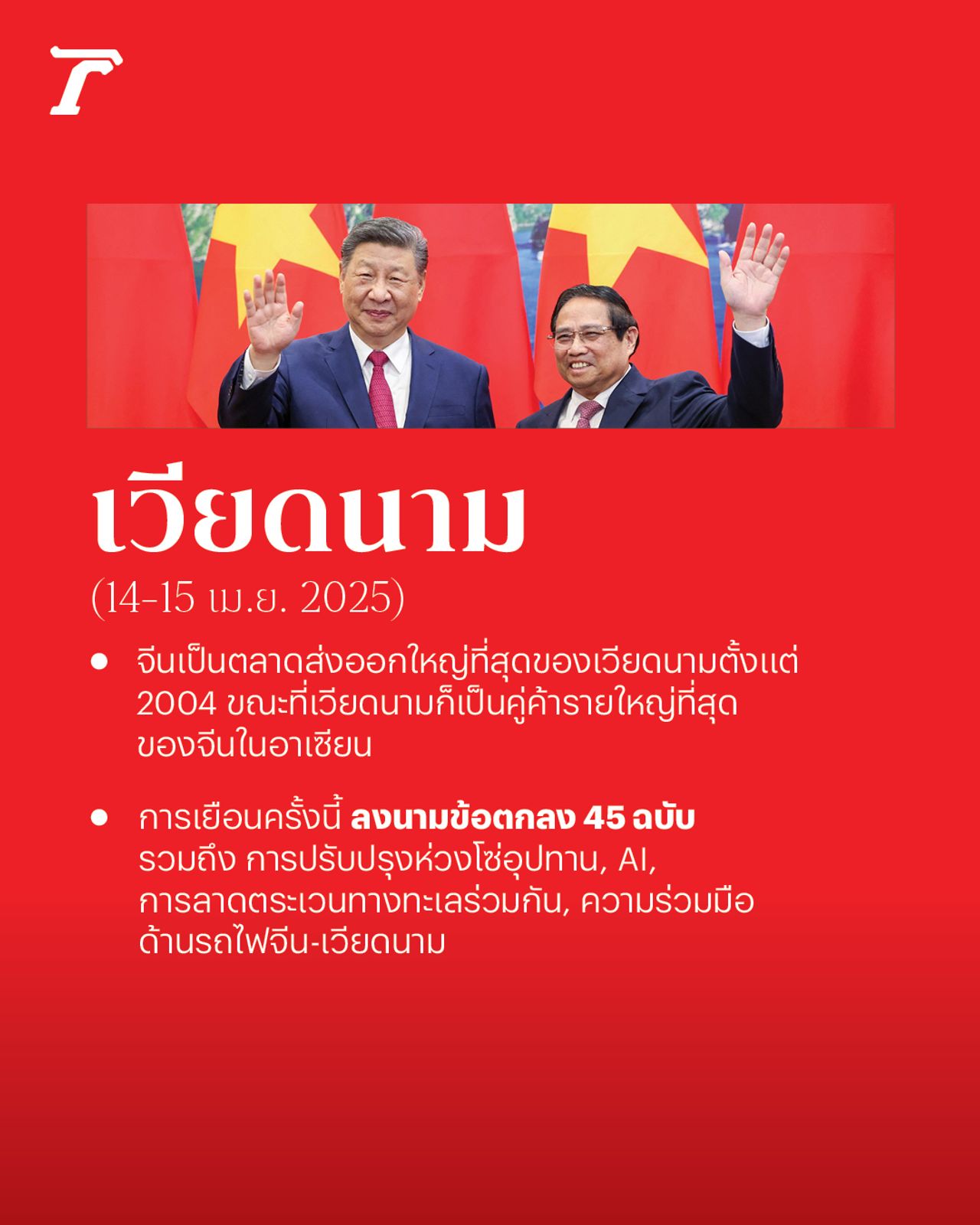 ทั้งนี้ จีนและเวียดนามมีความสัมพันธ์ทางการทูตมาอย่างยาวนาน 75 ปี และจีนถือเป็นประเทศคู่ค้าอันดับ 1 ของเวียดนาม นับตั้งแต่ปี 2003 ขณะเดียวกันเวียดนามก็เป็นคู่ค้าอันดับหนึ่งของจีนในภูมิภาคอาเซียน โดยในปี 2024 มูลค่าการค้าระหว่างทั้งสองประเทศอยู่ที่กว่า 2.6 แสนล้านดอลลาร์สหรัฐฯ (ราว 8.68 ล้านล้านบาท)