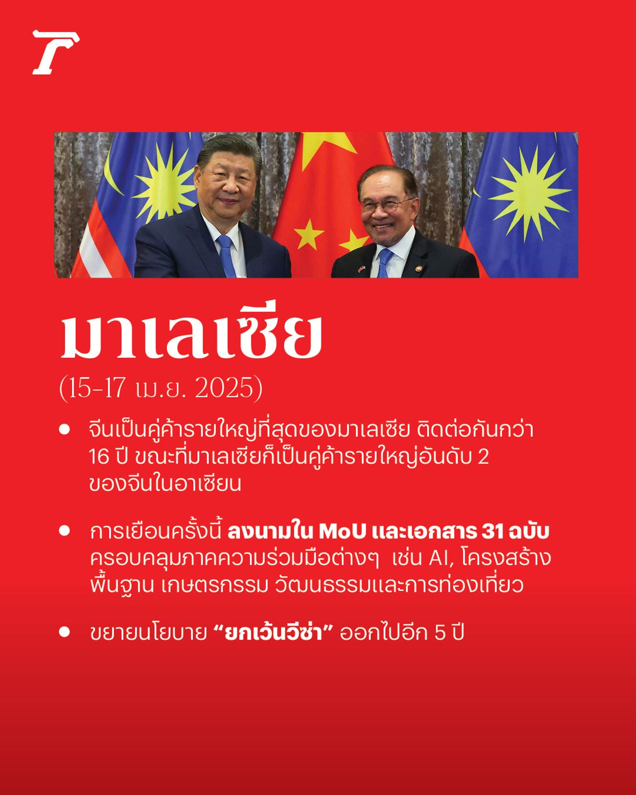 ทั้งนี้ จีนและมาเลเซียมีความสัมพันธ์ทางการทูตมาอย่างยาวนาน 50 ปี และจีนถือเป็นประเทศคู่ค้าอันดับ 1 ของมาเลเซียติดต่อกันเป็นเวลา 16 ปี ขณะเดียวกันมาเลเซียก็เป็นคู่ค้าอันดับสองของจีนในภูมิภาคอาเซียน โดยในปี 2024 มูลค่าการค้าระหว่างทั้งสองประเทศอยู่ที่กว่า 2.12 แสนล้านดอลลาร์สหรัฐฯ (ราว 7.07 ล้านล้านบาท) และมาเลเซียยังเป็นชาติแรกๆ ที่สนับสนุนโครงการหนึ่งแถบหนึ่งเส้นทาง (Belt and Road Initiative - BRI) ของจีน โดยทั้งสองประเทศลงนามในบันทึกความเข้าใจ BRI ในปี 2017