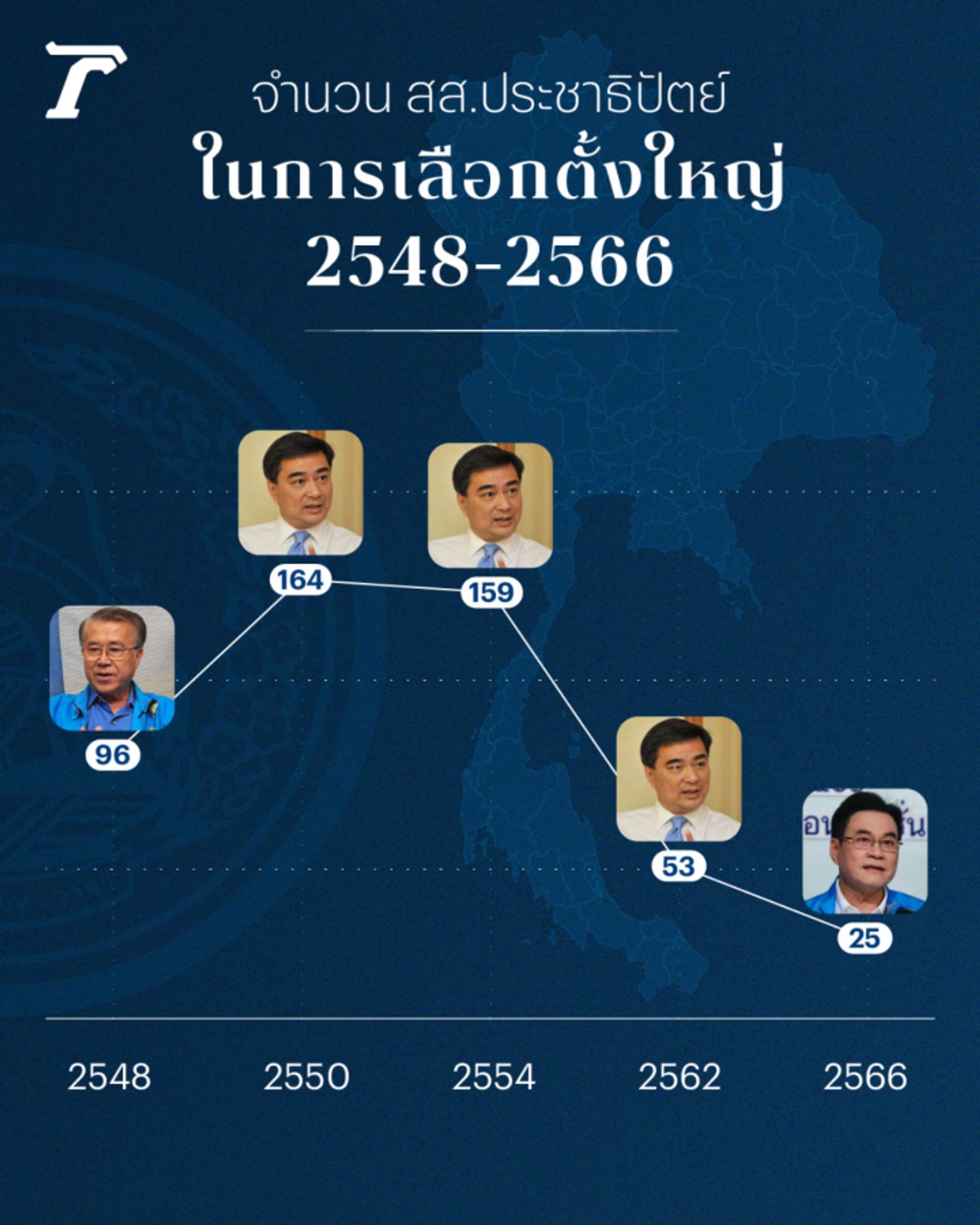 ย้อนกลับไปการเลือกตั้งใหญ่ หลายสนามก่อนหน้านี้ในช่วง 20 ปีหลังสุด พบว่า การเลือกตั้งทั่วไปในปี 2550 สนามแรกของหัวหน้าพรรคที่ชื่อ “นายอภิสิทธิ์ เวชชาชีวะ” พาพรรคประชาธิปัตย์สู่จุดสูงสุด ด้วยการคว้า สส. 164 คน แม้ว่าจะพ่ายแพ้ต่อพรรคพลังประชาชนไป แต่สุดท้ายก็ยังรวมเสียงปรับขั้วรัฐบาลจนได้นั่งเก้าอี้นายกรัฐมนตรี “คนสุดท้าย” ของพรรคประชาธิปัตย์