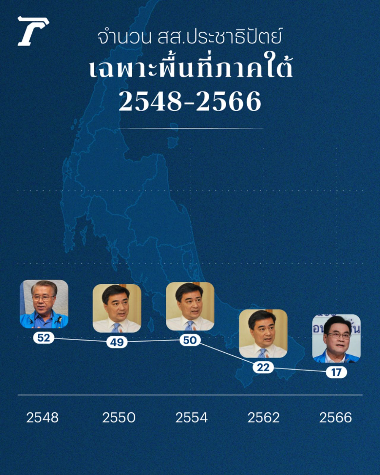 โดยในปี 2554 พรรคประชาธิปัตย์ ได้ สส. 50 จาก 53 คน, ปี 2562 ได้ สส. 22 จาก 50 คน และล่าสุดในปี 2566 ได้ สส. 17 จาก 60 คน แม้จะยังคงเป็นแชมป์อันดับที่ 1 พรรคที่ได้ สส.มากที่สุดในภาคใต้ แต่ก็มีสัญญาณที่ชัดเจนว่า พรรคประชาธิปัตย์ ไม่ได้เป็นที่พึ่งพิงเดียวของประชาชนคนใต้อีกต่อไปแล้ว
