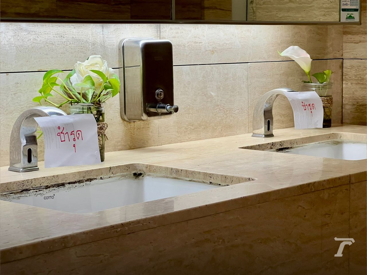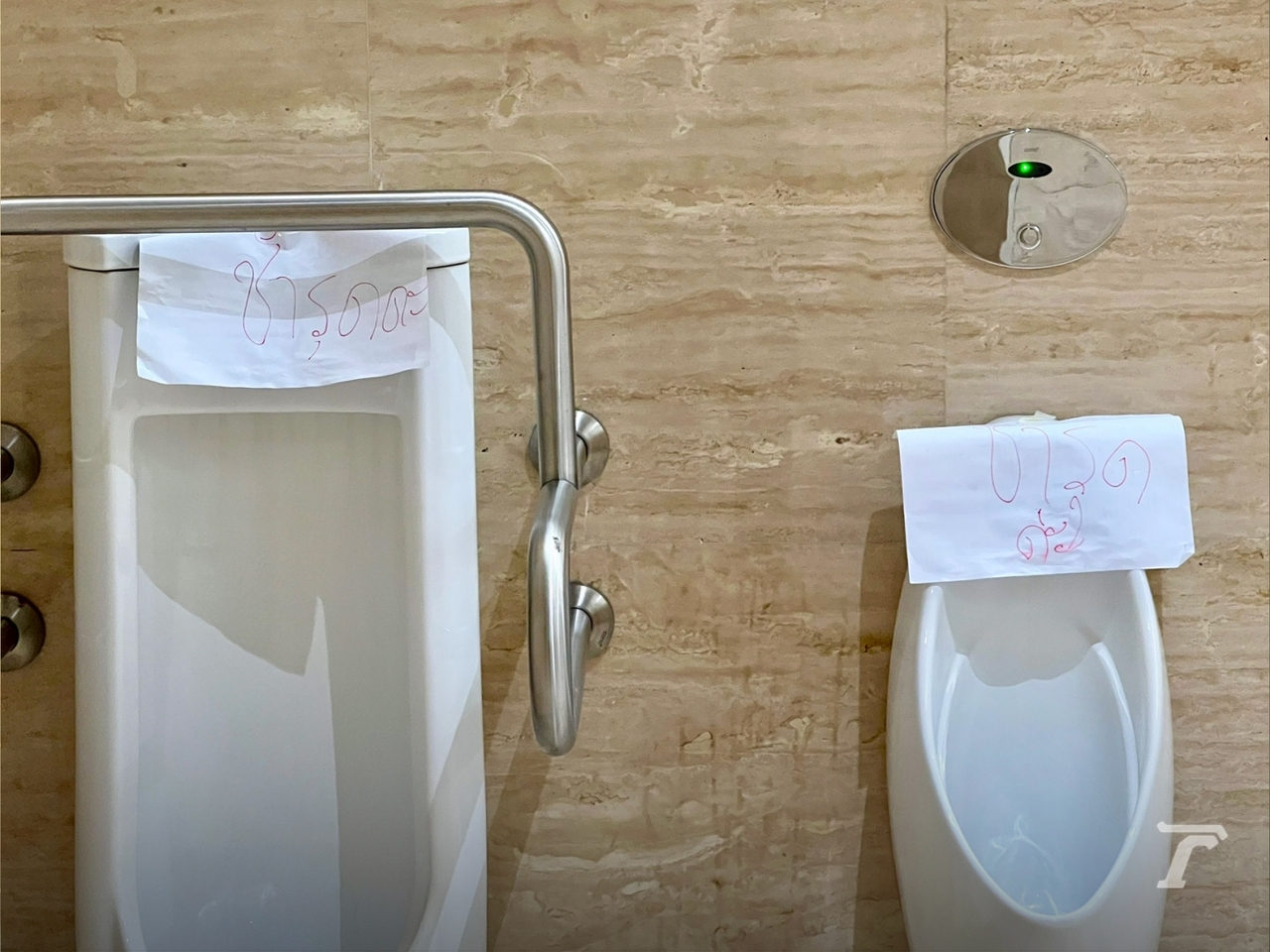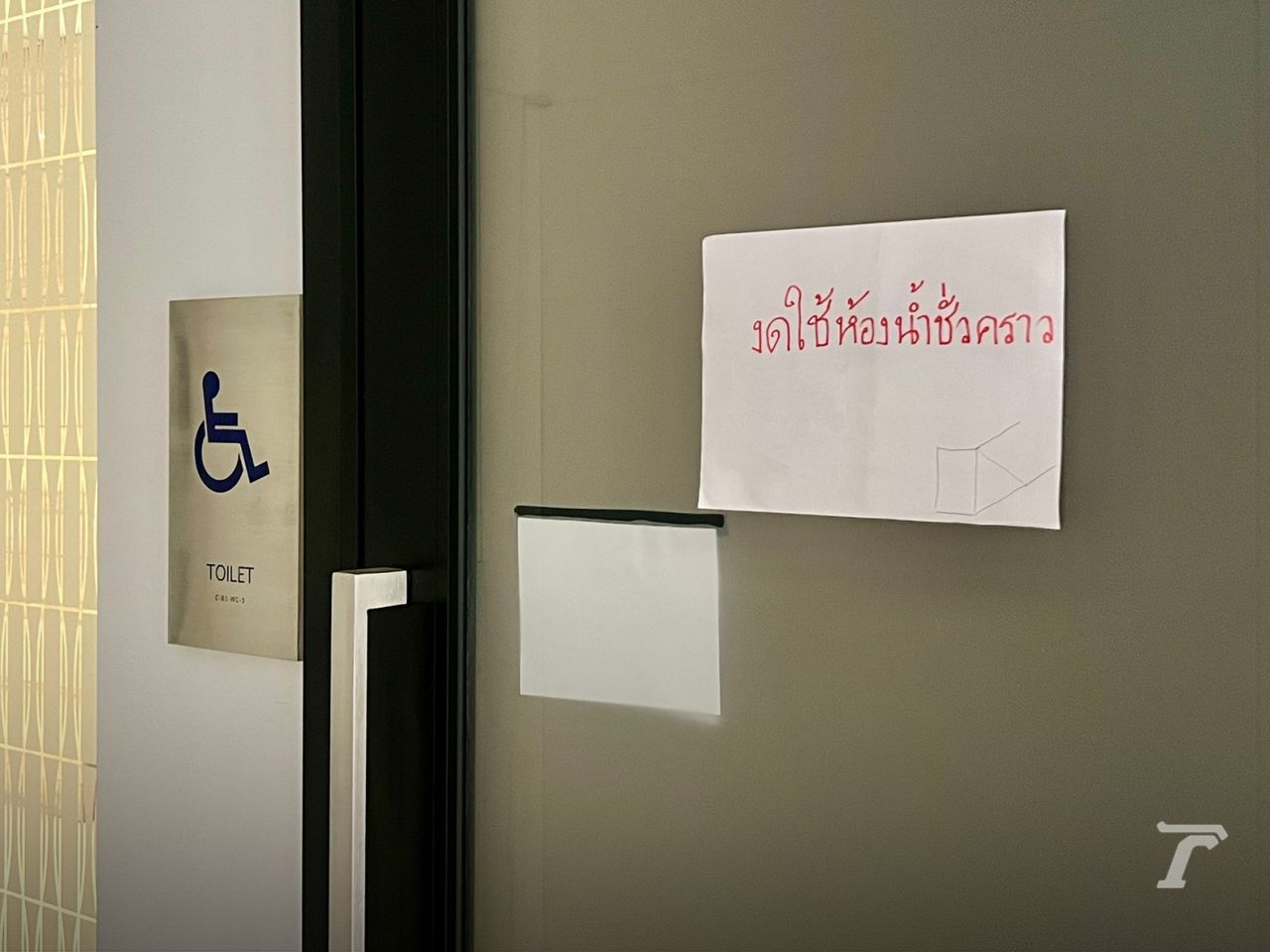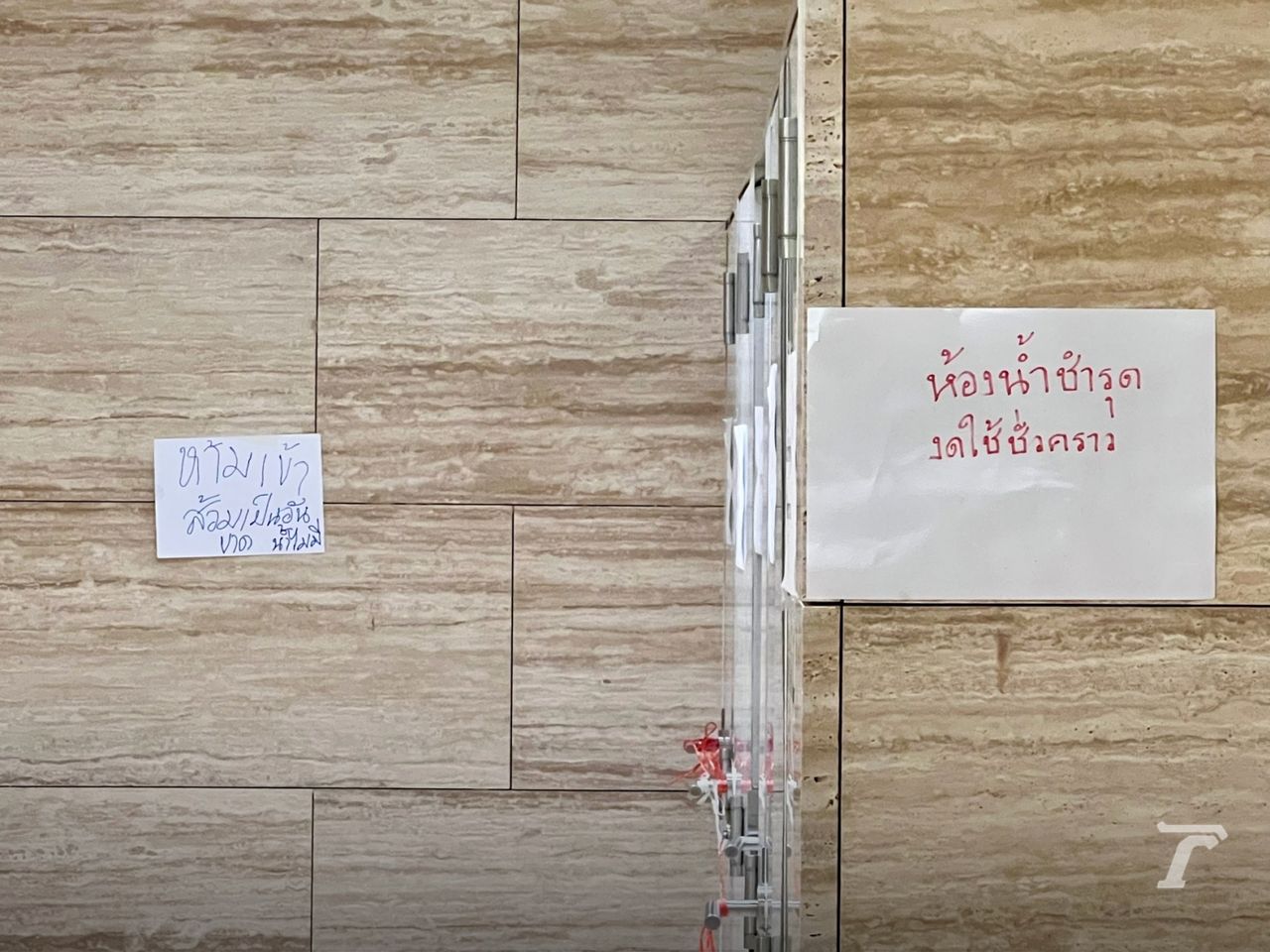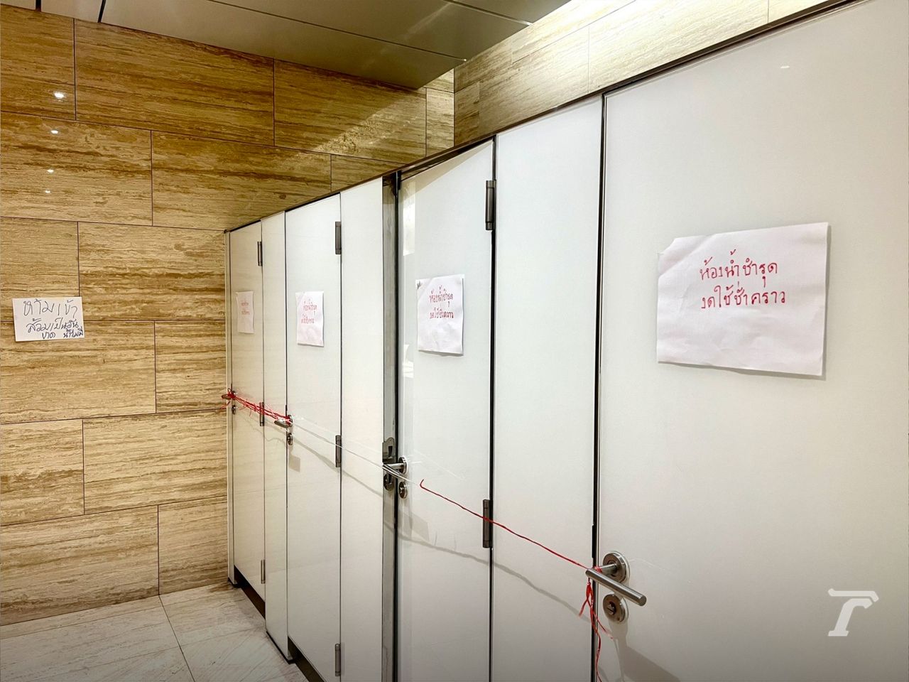 จากการลงไปสำรวจพบว่า บริเวณด้านหน้าห้องน้ำคนพิการ แปะกระดาษพร้อมเขียนข้อความว่า “งดใช้ห้องน้ำชั่วคราว” เมื่อเข้าไปที่ห้องน้ำชายพบว่า ห้องน้ำทั้ง 5 ห้องชำรุด และถูกปิดล็อกเอาไว้ ส่วนโถปัสสาวะใช้ได้ 10 จาก 13 โถ ขณะที่อ่างล้างมือทั้ง 2 อ่าง น้ำไม่ไหลและไม่สามารถใช้งานได้ โดยมีการแปะกระดาษข้อความทั่วทุกจุด