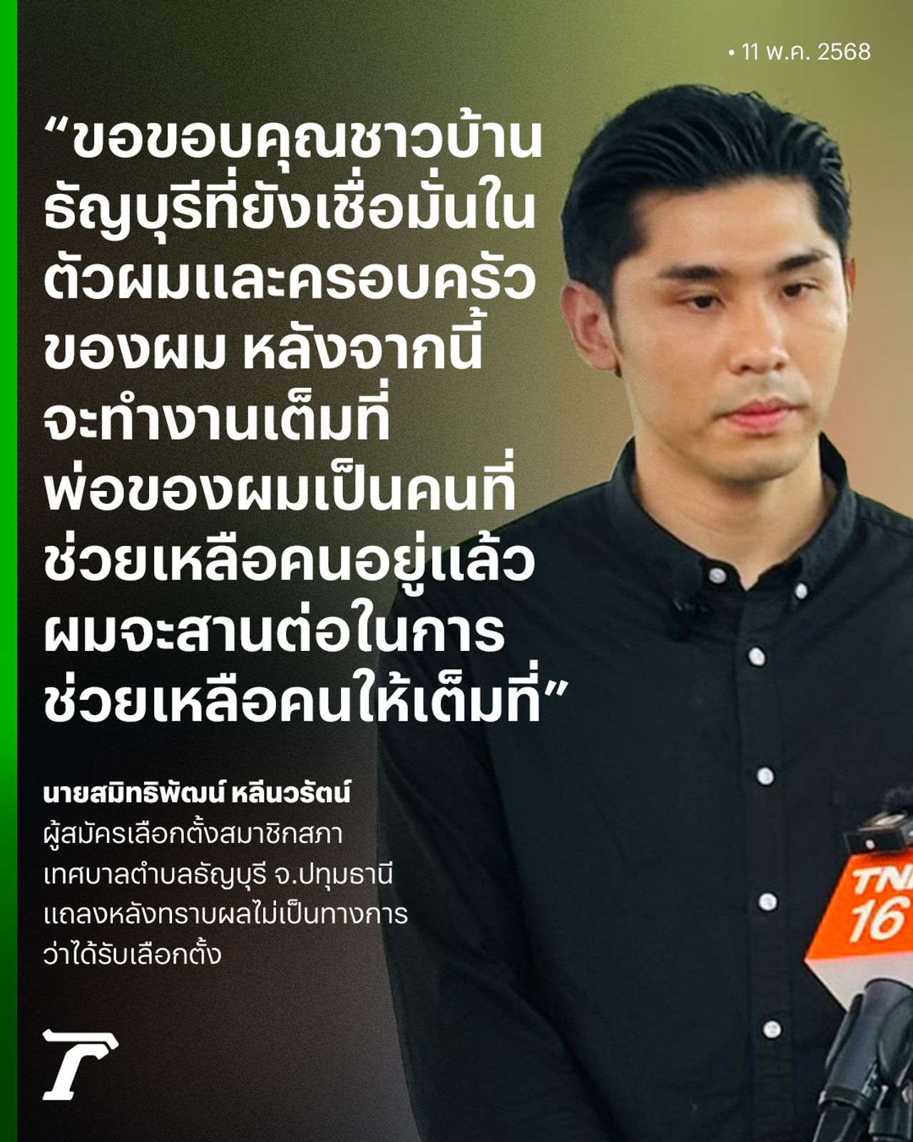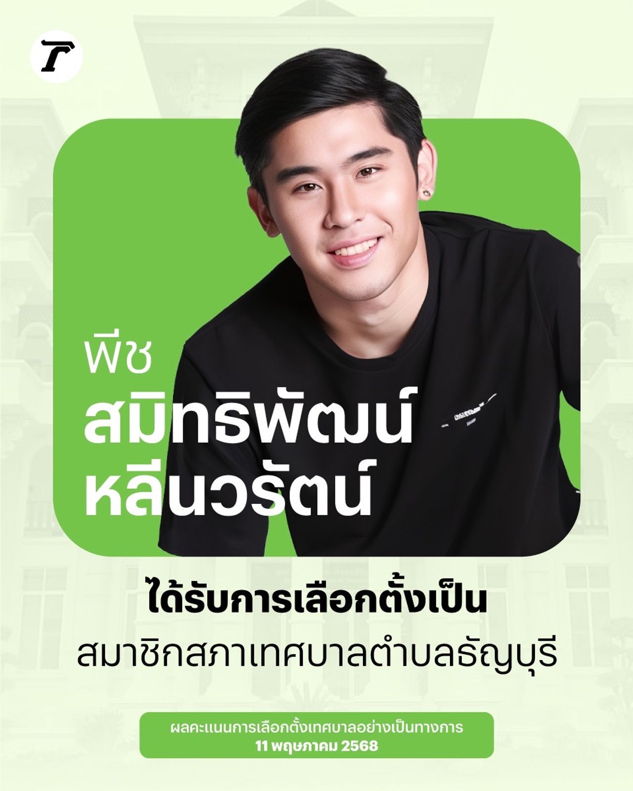 วันที่ 11 พฤษภาคม 2568 ผู้สื่อข่าวรายงานว่า ในการเลือกตั้งสมาชิกสภาเทศบาลตำบลธัญบุรี และนายกเทศมนตรีธัญบุรี จังหวัดปทุมธานี ล่าสุด ผลการนับคะแนนออกมาอย่างไม่เป็นทางการ ปรากฏว่า นายสมิทธิพัฒน์ หลีนวรัตน์ หรือ พีช ลูกชายของนายกฤษดา หลีนวรัตน์ หรือนายกเบี้ยว อดีตนายกเทศมนตรีธัญบุรี และนางยุพเยาว์ หลีนวรัตน์ หรือรองน้ำอ้อย ได้รับการเลือกตั้งเป็นสมาชิกสภาเทศบาล
