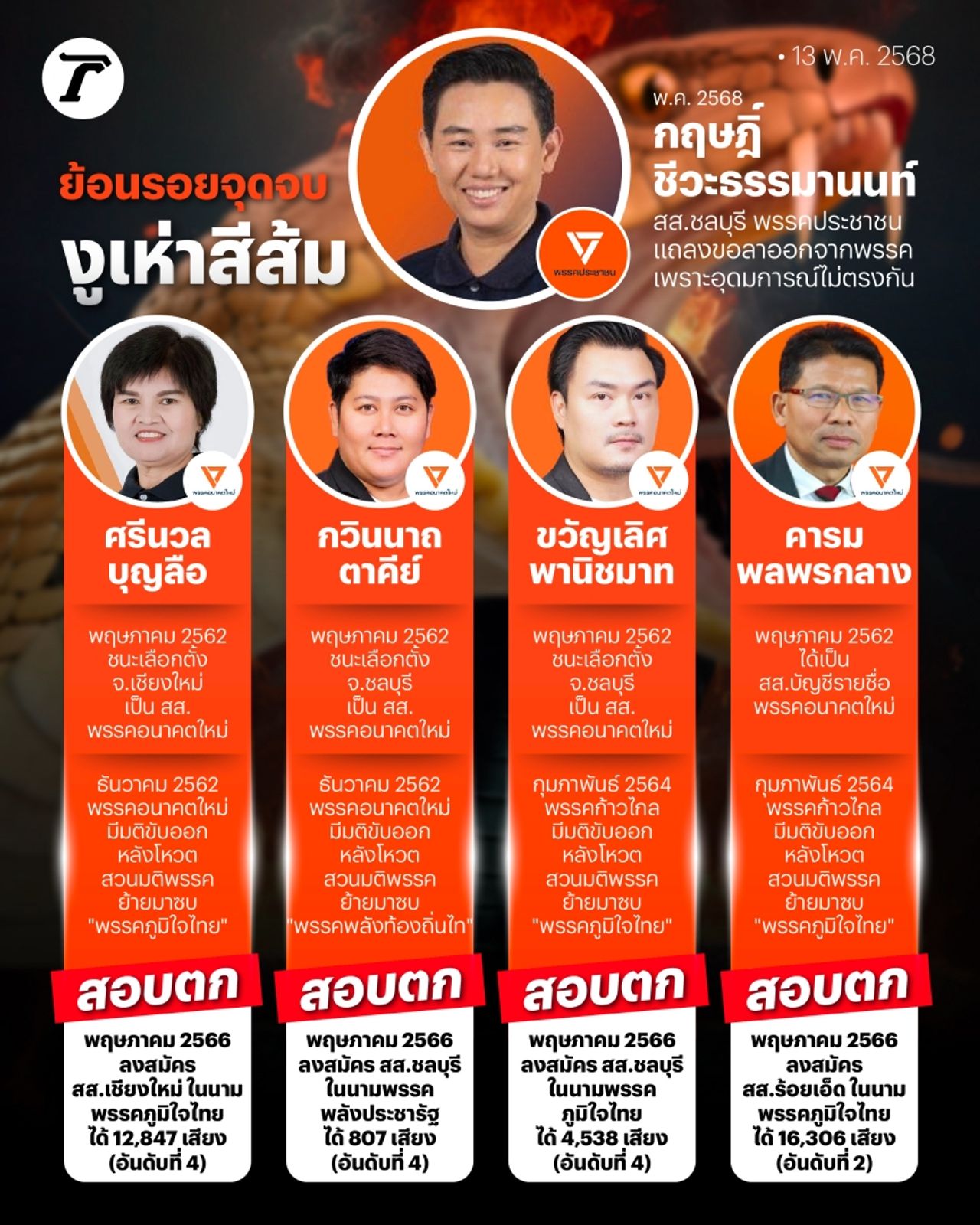พาไปย้อนดูเส้นทางการเมืองของสมาชิกสภาผู้แทนราษฎร (สส.) ของ "พรรคสีส้ม" ตั้งแต่พรรคอนาคตใหม่ พรรคก้าวไกล มาจนถึงพรรคประชาชน เจเนอเรชันที่ 3 ในปัจจุบัน ที่มี สส.นับสิบราย เลือกโหวตสวนมติพรรค หรือตัดสินใจแยกทางสลับไปขั้วตรงข้าม จนถูกเรียกว่าเป็น “งูเห่า” แต่สุดท้ายก็ไปไม่รอด ถูกปลายปากกาของประชาชนตัดสินในวันเลือกตั้ง ไม่มีใครเคยได้กลับมานั่งในสภาฯ เลยแม้แต่คนเดียว และส่วนใหญ่คะแนนเลือกตั้งในนามพรรคอื่นก็อยู่แค่หลักร้อย-พันเท่านั้น น้อยคนมากที่จะไปถึงหมื่น แต่สุดท้ายก็ยังพ่ายแพ้ไปอยู่ดี