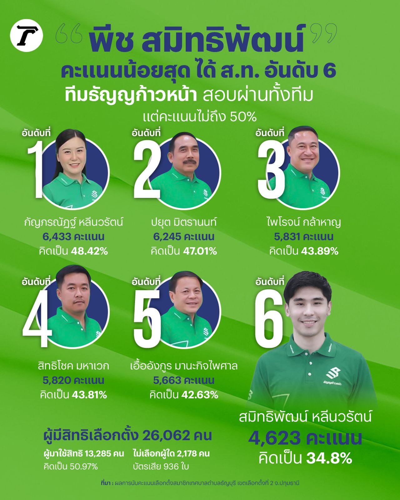 แม้ว่าทีมธัญญก้าวหน้า จะสอบผ่านทั้งทีม รวมถึง “น้ำอ้อย” แม่ของพีช ที่ได้เป็นนายกเทศมนตรีเทศบาลตำบลธัญบุรีแล้ว แต่จากคะแนนที่ออกมาก็น่าสนใจว่า “พีช” ลูกชายของตระกูลดังในพื้นที่ธัญบุรี เจอกระแสข่าวเชิงลบ จนได้อันดับสุดท้ายของทีม คงจะต้องเร่งทำผลงานในระยะเวลา 4 ปีในตำแหน่งให้ดี เพื่อพิสูจน์ตัวเองให้คนธัญบุรี และคนในสังคมเห็นศักยภาพ เพื่อลบล้างภาพจำจากข่าวที่ขับรถปาดหน้า 2 ลุงป้าจนเข้าโรงพยาบาลให้ได้