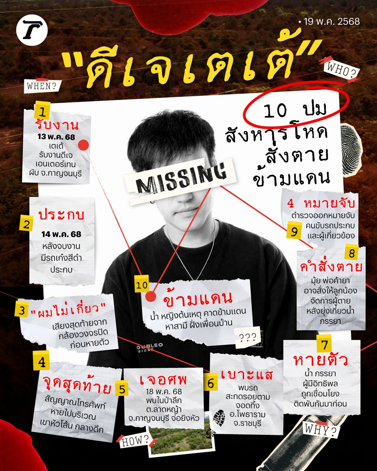 คดีสะเทือนขวัญ สังหารโหด “ดีเจเตเต้” ทิ้งป่าลึก จ.กาญจนบุรี หลังรับงานเอนเตอร์เทนในผับ ล่าสุดตำรวจออกหมายจับ 4 ผู้ต้องสงสัยอุ้มปิดปาก คาดสัมพันธ์ภรรยามาเฟียค้ายา แม้หลบหนีคดีอยู่ฝั่งเมียนมา แต่ให้ลูกน้องสะกดรอยตาม หลังพบยังไม่เลิกสานสัมพันธ์ สั่งลูกน้องตามประกบก่อเหตุ
